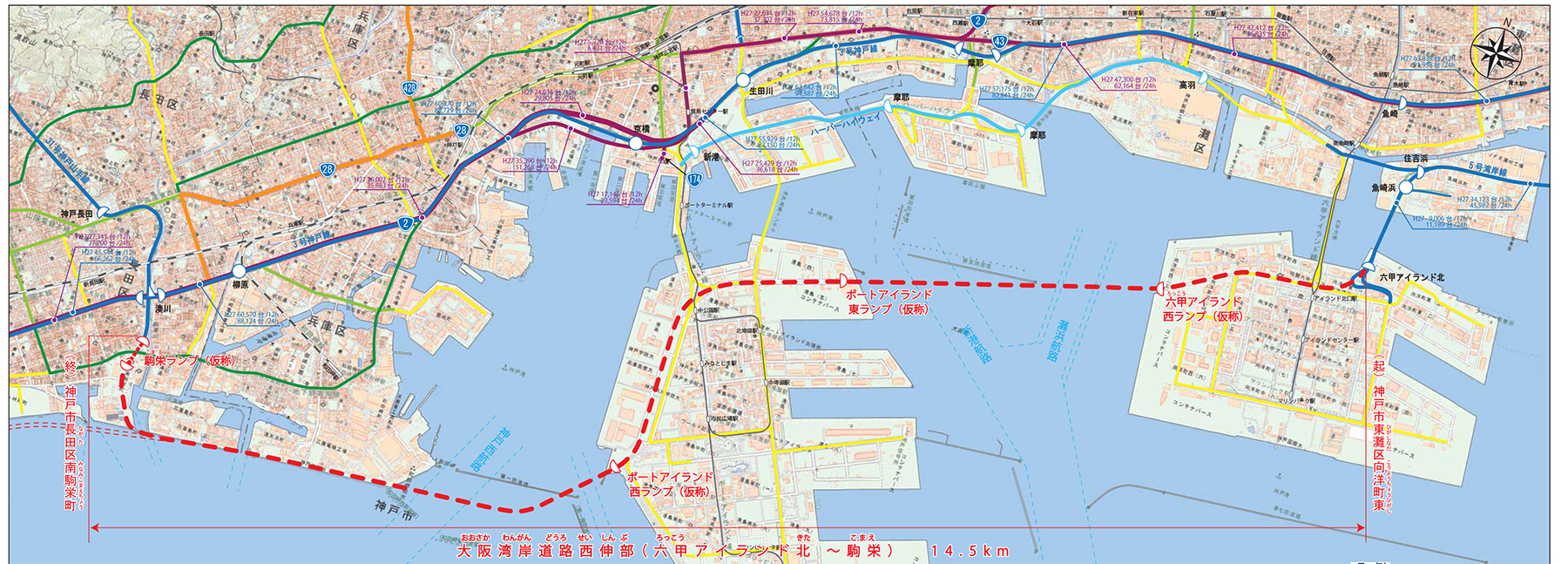 粟津 大阪湾岸道路については、関西国際空港(りんくうJCT)から神戸(六甲アイランド)までは平成6年に完成していますが、西伸部がなかなか進まない状態でした。平成28年度に六甲アイランド北~駒栄間14.5kmが国直轄事業として事業化され、平成29年度からは、阪神高速道路との合併施工方式を導入することが決まりました。