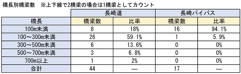 大塚 管理橋梁は、長崎道と長崎バイパスあわせて61橋(本線橋のみ)です。そのうち鋼橋が37%、PC橋が42%、RC橋が21%とPC橋の割合が多くなっています。また、延長別では、長崎道と長崎バイパスあわせて、500m以上が4橋、100m以上500m未満が33橋、100m未満が24橋となります。