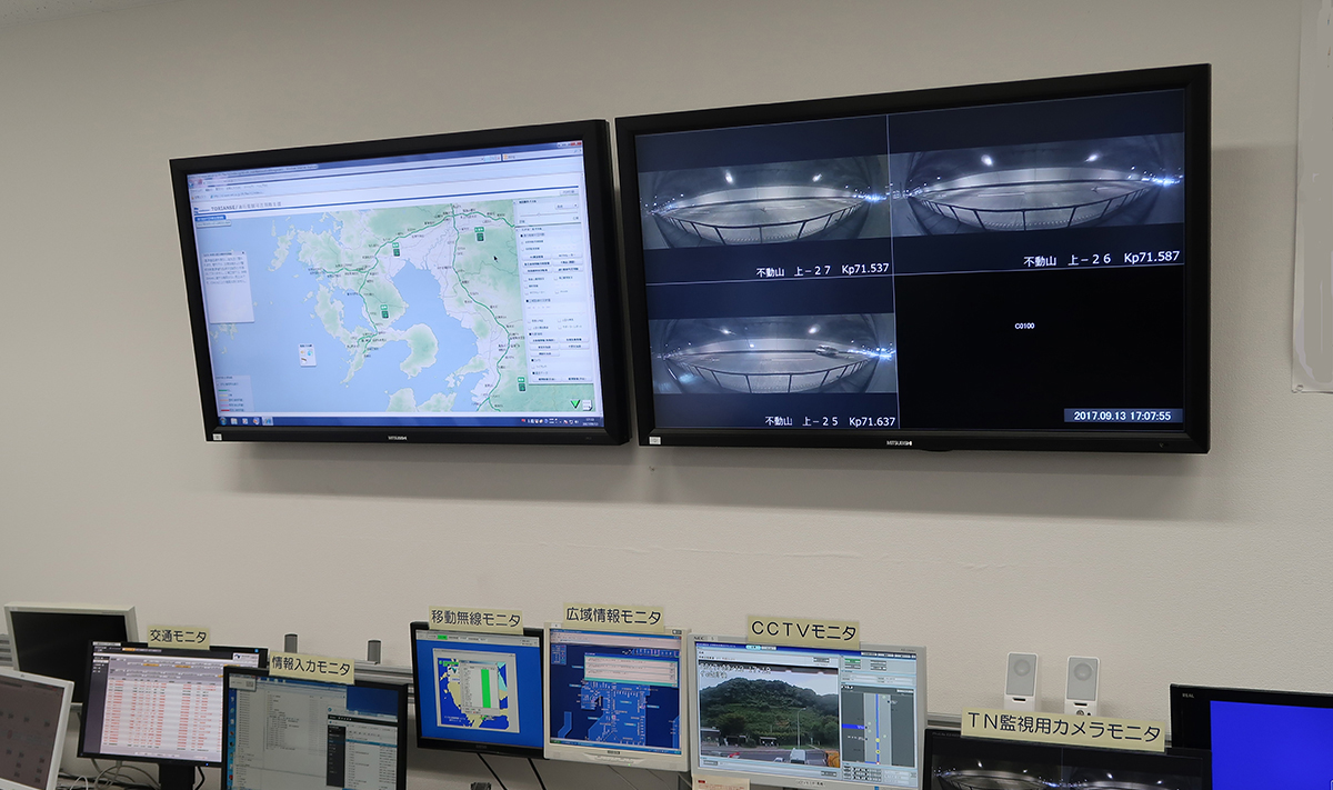 大塚 非常時の情報収集と共有は、初動での対応に大きく影響することから、ICTの活用による見える化が非常に重要だと考えています。監視カメラを4車線区間に設置していますし、局地的に降雪量が多い箇所などには増設を計画しています。不動山トンネル(下り線)では、建設中の新名神でも導入されるカメラシステムを先行運用しています。これは、トンネル内で火災検知がされた場合、検知された周辺にカメラが自動で切り替わり、左右ふたつのカメラの動画を合成処理し、180度の視界を確保する「双眼監視カメラ」となっています。NEXCO西日本の管制室で24時間監視していて、事務所内の防災対策室でも見られるようになっていますので、迅速で詳細な状況把握が可能となります。