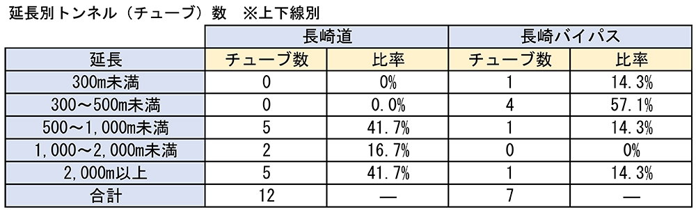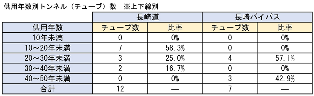 大塚 長崎道と長崎バイパスで合計13トンネル19チューブを管理しています。供用年数別では、10~20年と20~30年がそれぞれ7チューブ、30~40年が2チューブで、40年以上が3チューブとなっています。