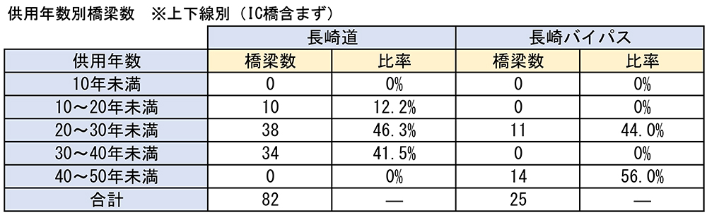 IC橋を含まない上下線別の供用年数別では、長崎道の長崎多良見IC~長崎ICと嬉野IC~東そのぎICⅡ期線の10橋が10~20年で、20~30年が大村IC~長崎多良見ICを除く区間の38橋となっていて、30年以上経過している橋梁は、34橋です。長崎バイパスでは20~30年が11橋、40年以上経過している橋梁が14橋となっています。