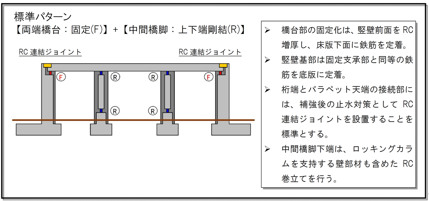 対策方法は、ロッキング橋脚をRCもしくは鋼板により巻き立てて壁式橋脚化し、基礎並びに上部構造と剛結させることにより自立性を確保する工法を標準としています。さらに橋台部もL2地震動に対して、耐震性能を満足するように補強(前面に増厚)し、上部構造と固定化します。ただし、既設橋の条件によっては、この工法を採用できない橋もあります。