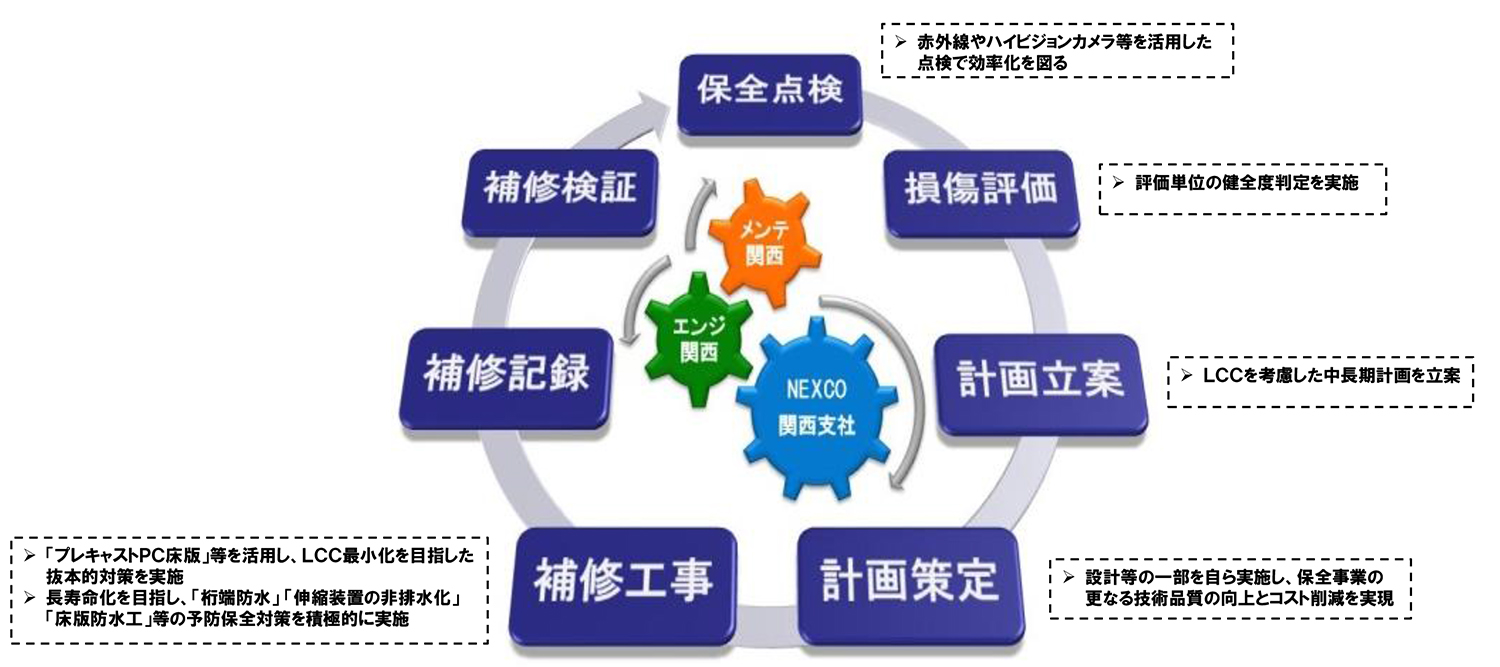中村 会社として、平成25年に「保全事業システム推進五箇年計画」を策定し、維持管理サイクルを行う保全事業システムという事で、点検・診断・補修・記録を回すために会社全体で取り組んでいます。従前は点検、補修などが各自独立した形で行われていたきらいがあり、時々見落としなどがあったことも事実としてあります。そのため、予防保全の観点からもしっかり点検をして、損傷を見逃さないようにし、すべての損傷に対して診断し、しっかりと手を打っていきます。こうした保全事業システムをNEXCO西日本とグループ会社が一体となって構築しています。