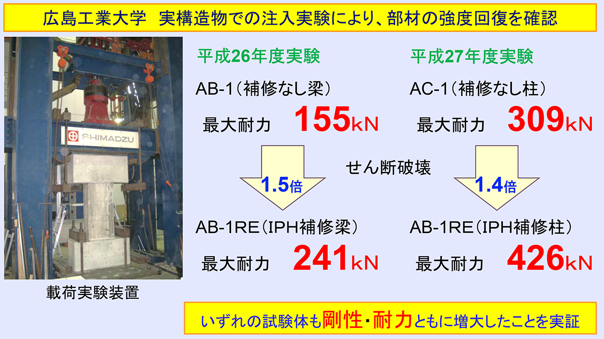 強度回復では、せん断破壊をしたときの強度比較を広島工業大学で実構造物を用いて実験を行ったところ、補修なしの梁と比較してIPH工法で補修した梁は、剛性、耐力ともに約1.5倍増大したことが実証されています。