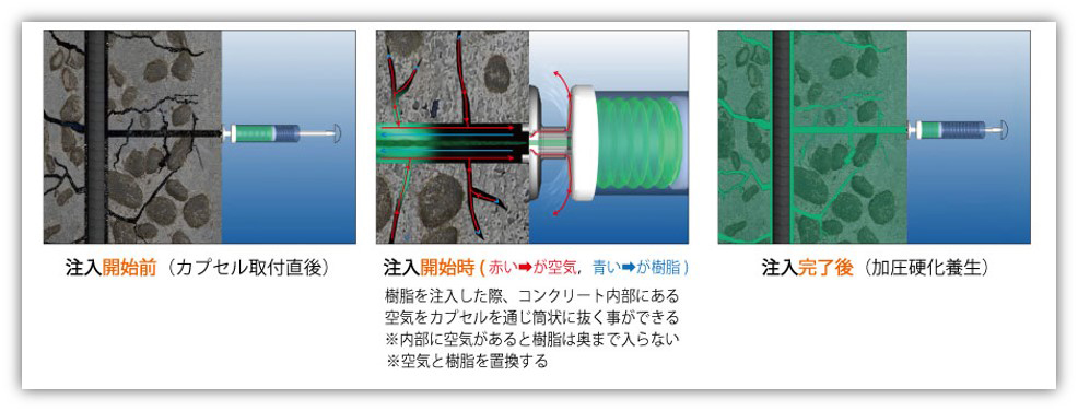これまでコンクリート内部に存在する空気と注入剤である樹脂を置換するという考え方はなく、これがIPH工法の特許の大きな要素となっています。真空状態を内部につくることで末端の微細なひび割れまで樹脂を充填できて、構造物の内部を健全化していきます。