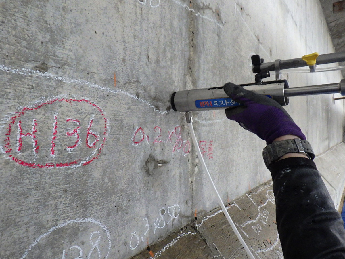 加川 エポキシ樹脂をベースとした特殊混合のものです。コンクリート内部は湿潤状態ですので、その水分と融合できる親和特性を持たせた樹脂としています。