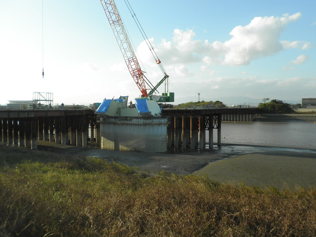 安部 早津江川橋(仮称)は1連で上部工は約6,000tあります。スプリンギングはとても重要な部位ですので、それだけで約100tの重さがあるため3分割して台船による運搬・架設しました。