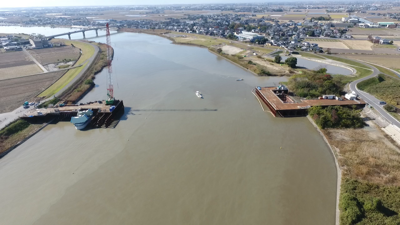安部 明治23 年にできた長さ6.5 ㌔、幅5.7 m(張石部)、全幅11.5 m(捨石部含む)の石積みの堤です。デ・レイケ導流堤は、河道のほぼ中央部に設置されており、その機能は川幅を狭くすることで流速を速くし、河口付近でのガタ土の堆積を防止することで航路を維持する機能を果たしています。基礎部はオランダからの導入工法である粗朶沈床(そだちんしょう)と呼ばれる雑木の枝葉を束ねたものを沈め、軟弱な地盤にも耐えうる構造としています。完成から100 年以上経た現在もその役割を果たし、当時の姿を残している土木構造物として歴史的、技術的価値の高いものと言えます。一方で、建設当初の設計図は見つかっておらず、現在までに台風などで損傷を受けた際に石積み補修や一部改良工事が実施されているものの、大きな補修や改修の記録はなく、当時の姿をほぼそのまま残していると考えられており、技術性や歴史性、意匠性が高い反面、内部構造は明らかになっておりませんでした。