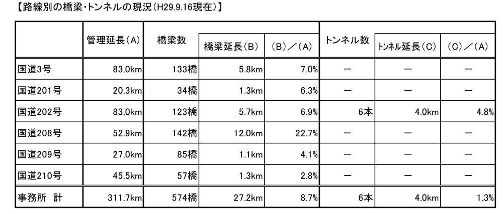 安部 福岡国道事務所が管理する道路延長は311.7kmに達しますが、構造物は橋梁が約9%、トンネルが約1%で、あとは土構造となっています。橋梁は有明海沿岸道路が属する国道208号が一番多く、橋梁数は142橋、橋梁延長は約12kmです。トンネルは国道202号に集中(6本4km)しており、他の路線にはありません。