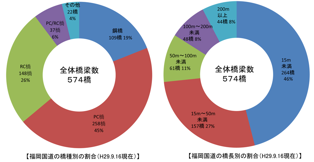 安部 当事務所の橋長2m以上の橋梁は574橋あり、そのうち15m未満の橋梁は46%とほぼ半数を占めます。その一方で100m以上の橋梁も92橋と16%に達します。