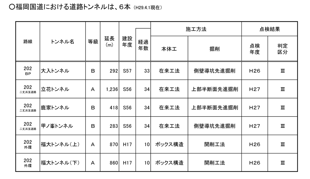 安部 トンネルは6本あり、施工方法は在来工法が4本、開削工法が2本となっています。供用年次は在来工法の4本が昭和56、57年度、開削工法の2本が平成17年度です。