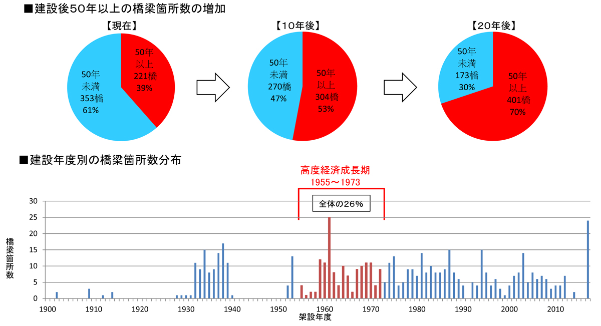 管内橋梁の平均年齢は45歳となっており、建設後50年を経過した橋梁は、現在で221橋(39%)に達していますが、10年後には304橋と過半(53%)に達し、20年後には401橋と7割に達します。