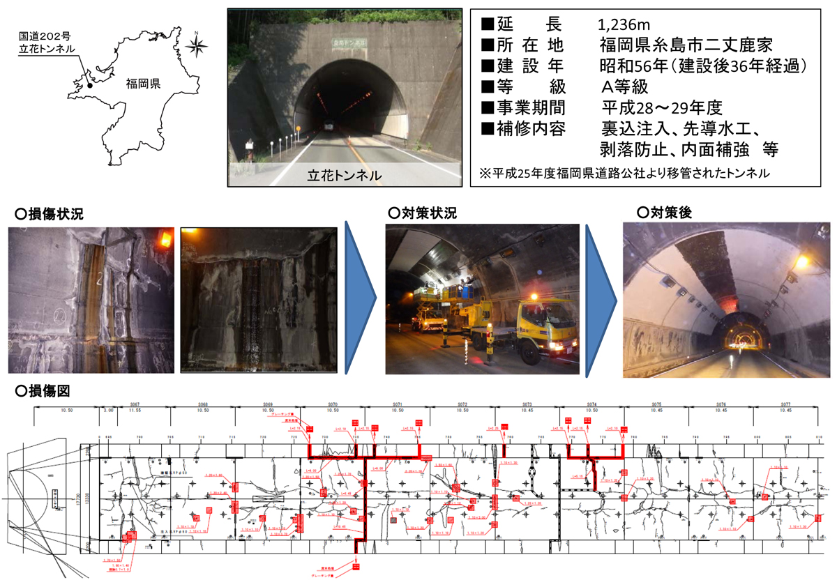 トンネルは定期点検の結果を踏まえ、定期的に監視を行い、必要に応じ措置を行っていきます。最近では損傷が顕著に出ていた立花トンネルで平成28~29年の2カ年をかけて、裏込注入、先導水工、剥落防止工、内面補強などを行いました。