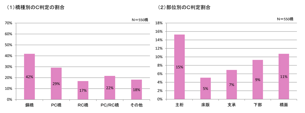 C判定の割合は鋼橋が比較的高く、鋼橋全体の4割に達しています。また、部位別では主桁の割合が高くなっています(全体の約15%)。損傷内容は、鋼橋が主に腐食、コンクリート橋が主にひび割れが多い結果となっています。