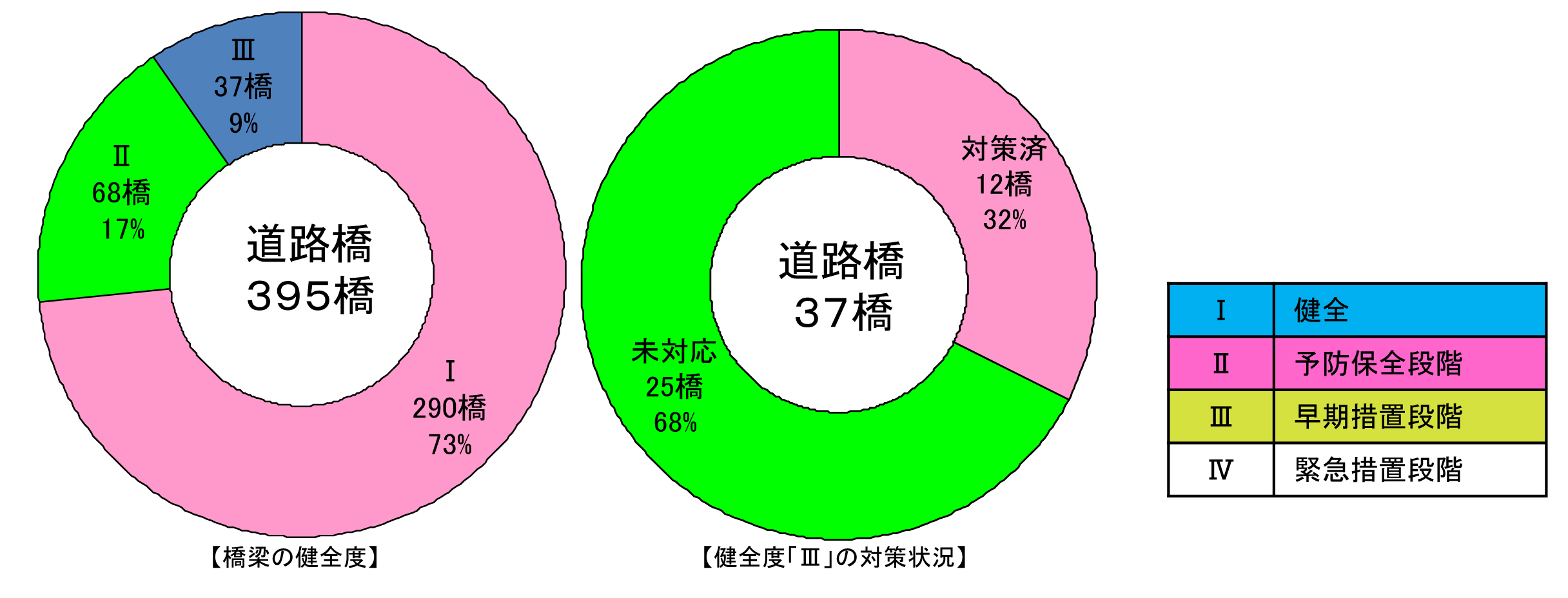 安部 平成26年に策定された定期点検要領に基づき、平成26~28年度の3カ年度で574橋中395橋の点検を実施した結果、早期措置段階とされるⅢ判定は37橋(9%)であることが確認されました。現在はその37橋のうち、12橋について対策を実施しています。