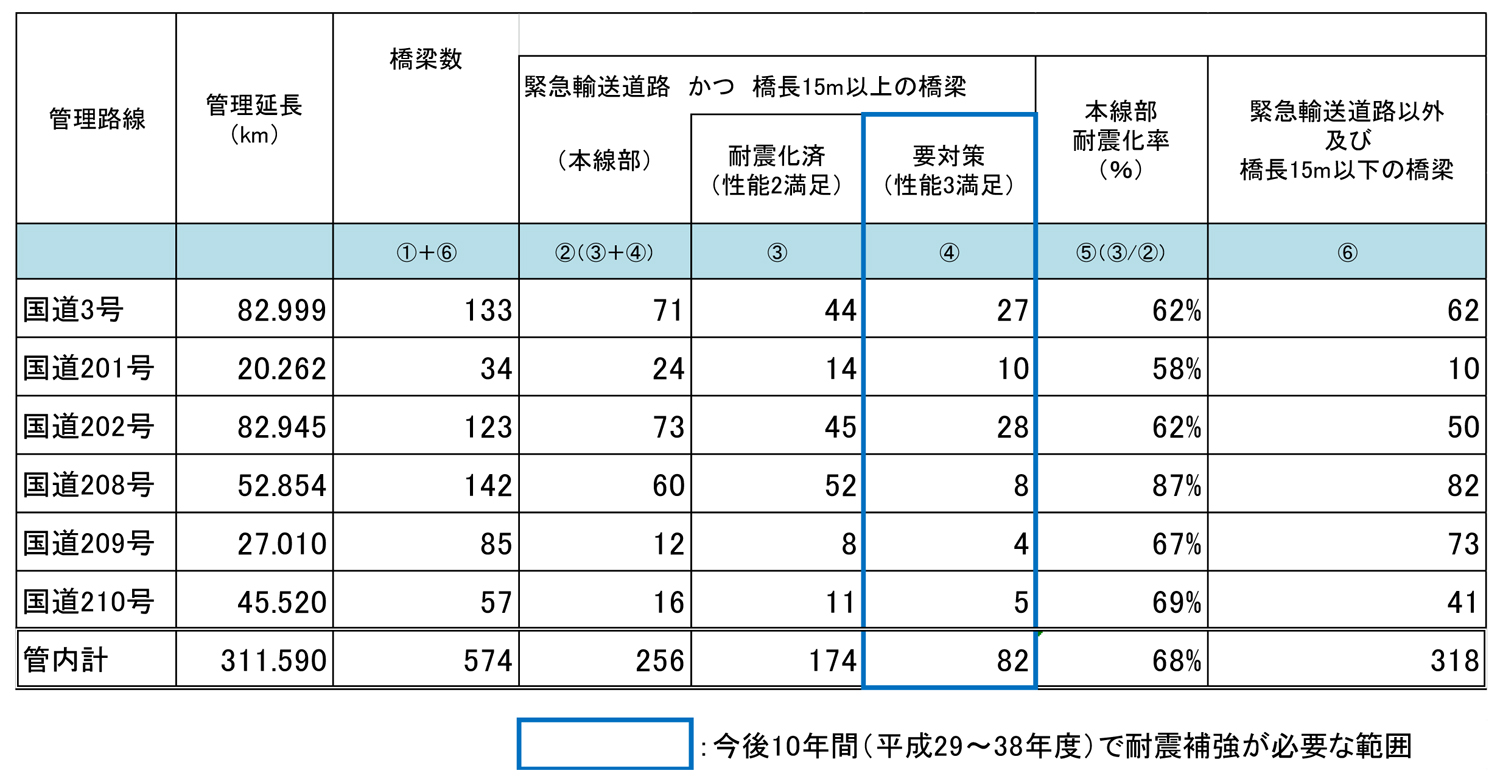 安部 管内574橋のうち、耐震補強の対象となる15m以上かつ、緊急輸送道路(本線)の橋梁は256橋となっています。このうち、今後10年で対策が必要(耐震性能2へのグレードアップも含め)な橋梁は82橋となっています。今年度は、国道3号の針摺高架橋(橋長187m、10径間(PC単純プレテンT桁橋+PC単純ポステンT桁橋2連+PC単純プレテンT桁橋4連+PC単純プレテン中空床版橋3連))と国道202号の深江第一高架橋(橋長100m、(PC3径間連結プレテンT桁橋+PC2径間連結プレテンT桁))の耐震補強を行っています。