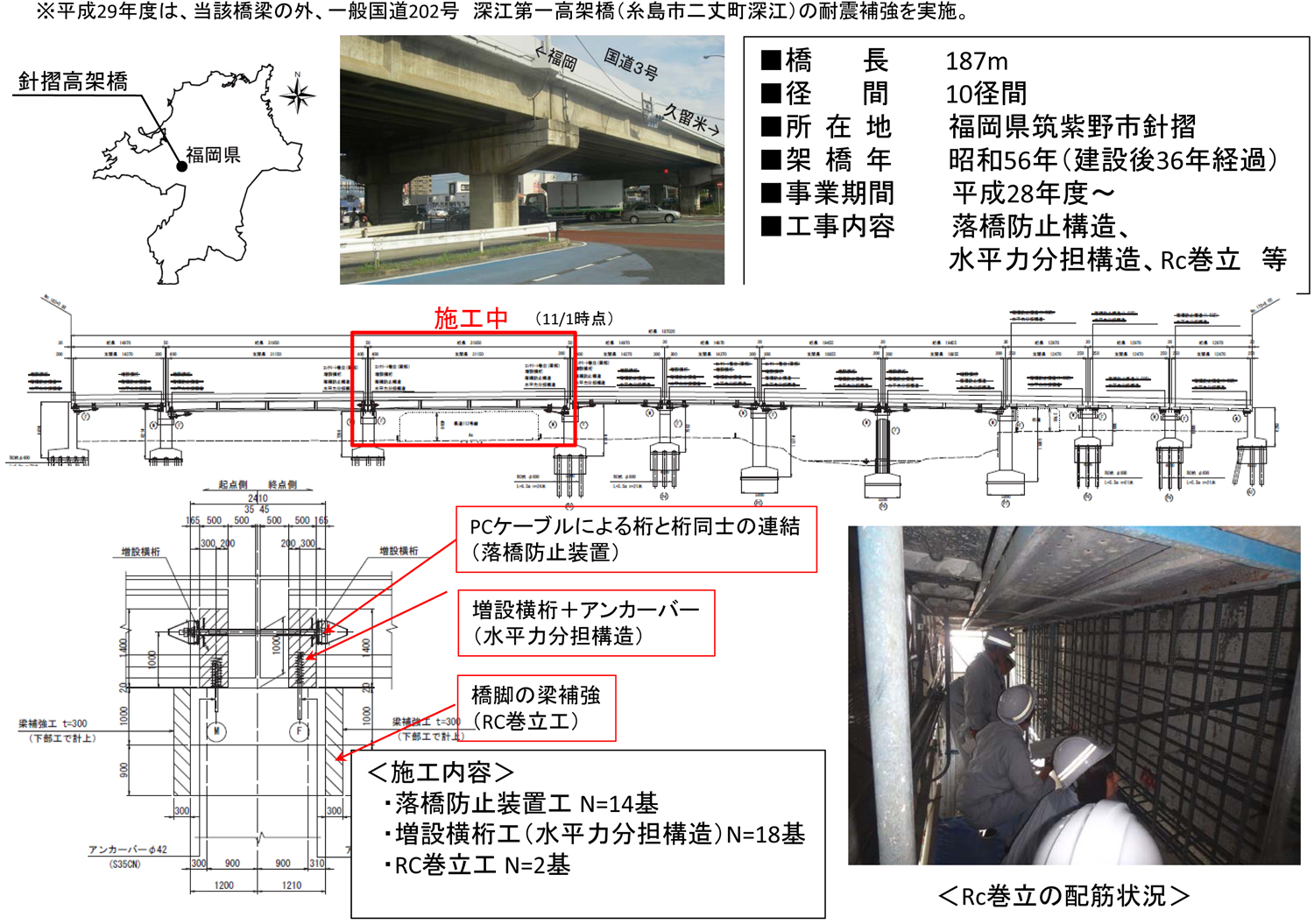 針摺高架橋では落橋防止装置を14基、増設横桁工(水平力分担構造)を18基設置し、橋脚のRC巻立工も2基で施工しています。