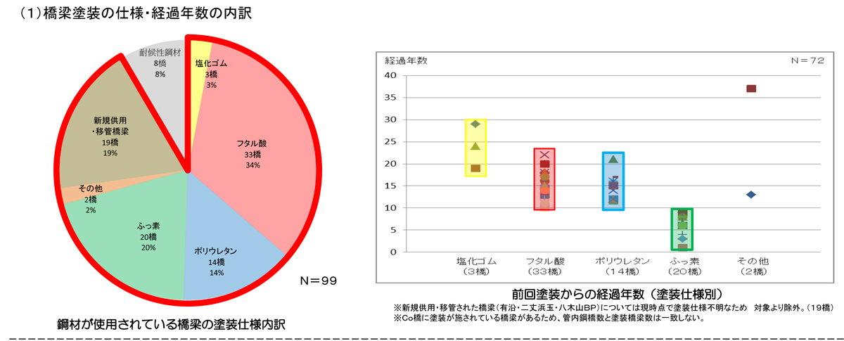 安部 今年度は3橋90㎡で部分塗替えを行う予定です。当事務所が管理する鋼橋塗装の内訳は、確認済みの99橋のうち、現況の塗装は塩化ゴム系が3橋、フタル酸系が33橋、ポリウレタン系が14橋、フッ素系が20橋、その他2橋となっています。また耐候性鋼材を採用している鋼橋は8橋です。