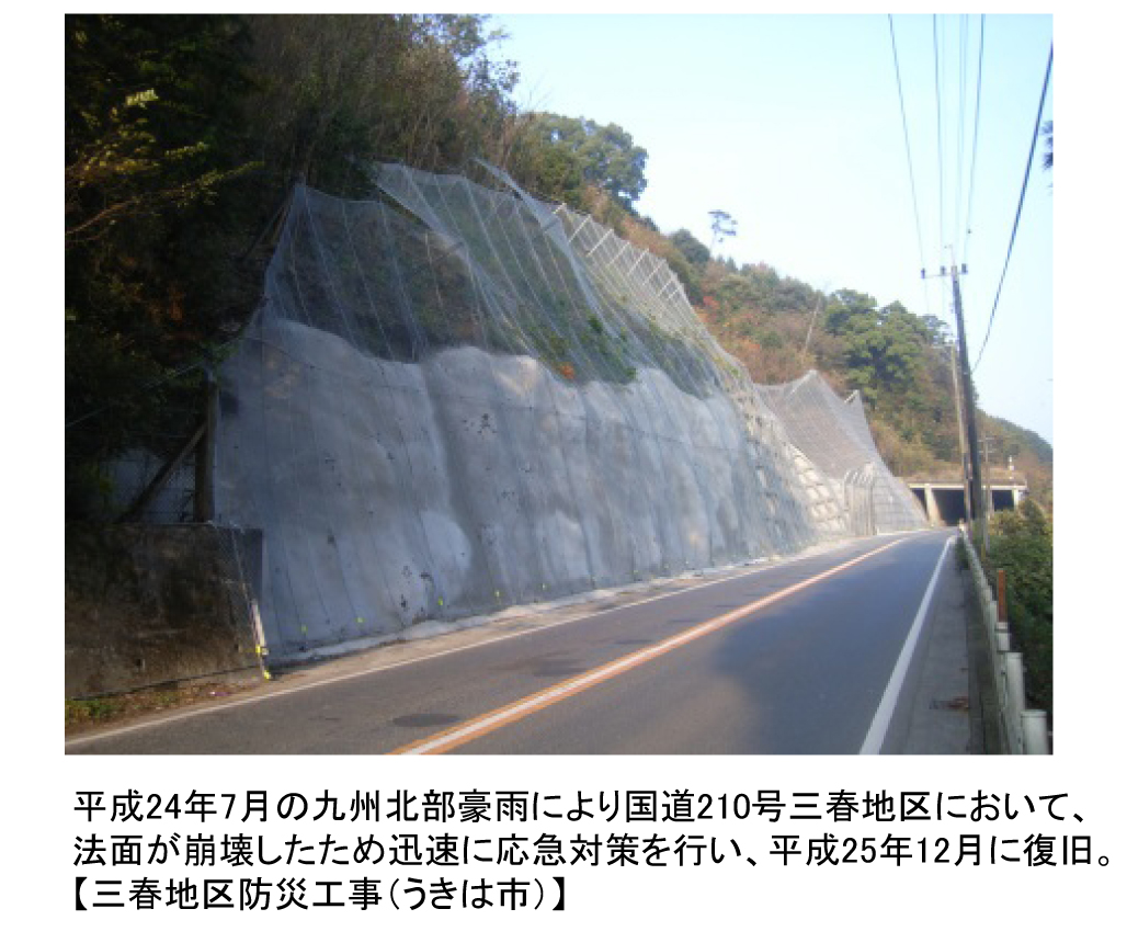 安部 5年前の話になりますが、平成24年7月の九州北部豪雨では、当事務所が管理している国道210号うきは市三春地区で法面の崩落が発生しました。平成25年12月までに復旧しました(下写真)が、その経験を踏まえ、日常の管理の中で、防災の観点から法面の点検を行い、梅雨前には側溝の清掃をするなど、地道ですが安全の確保に励んでいます。