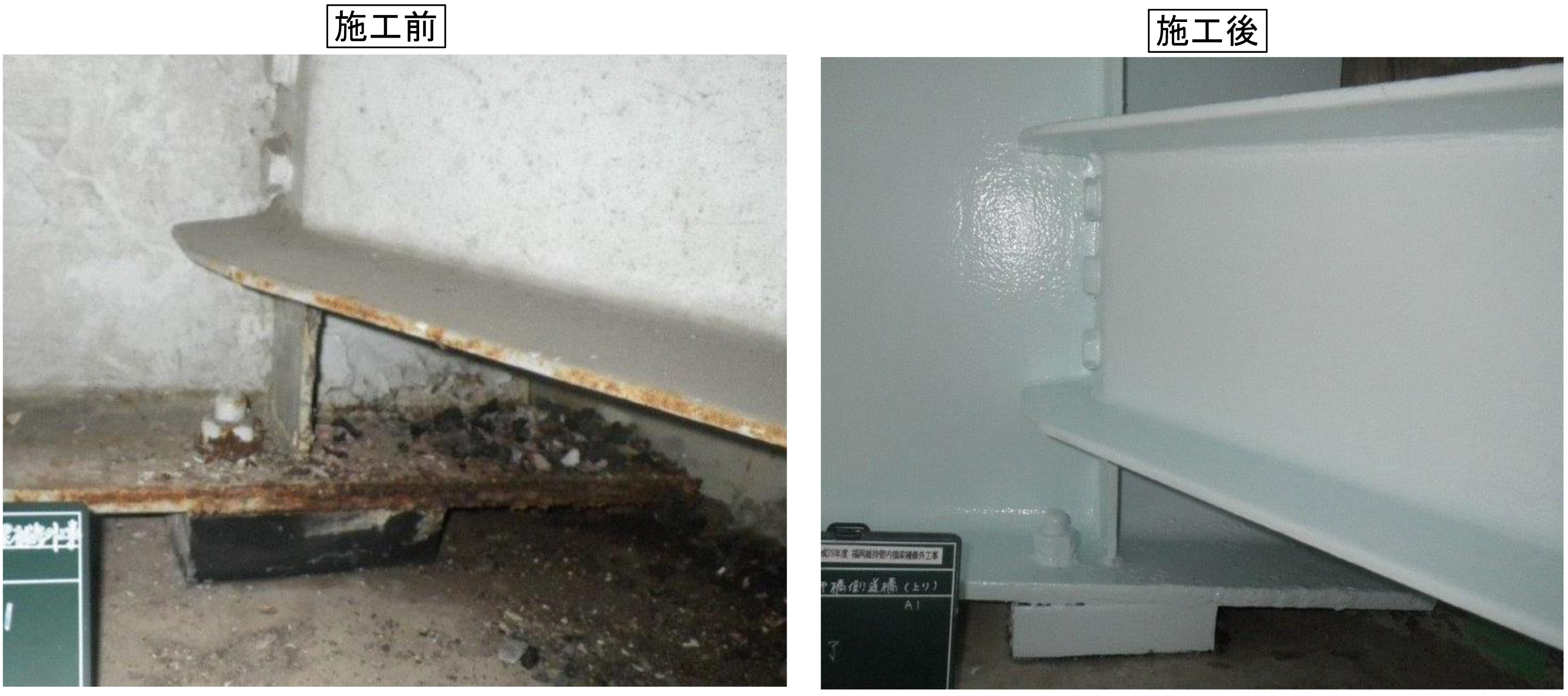 新しい重防食の採用事例としては、鋼製支承の腐食に対し、塗布することで安定化した皮膜を鋼材表面に形成し、鋼材を錆から長期的に守るNKさび安定化防錆工法を採用しています。