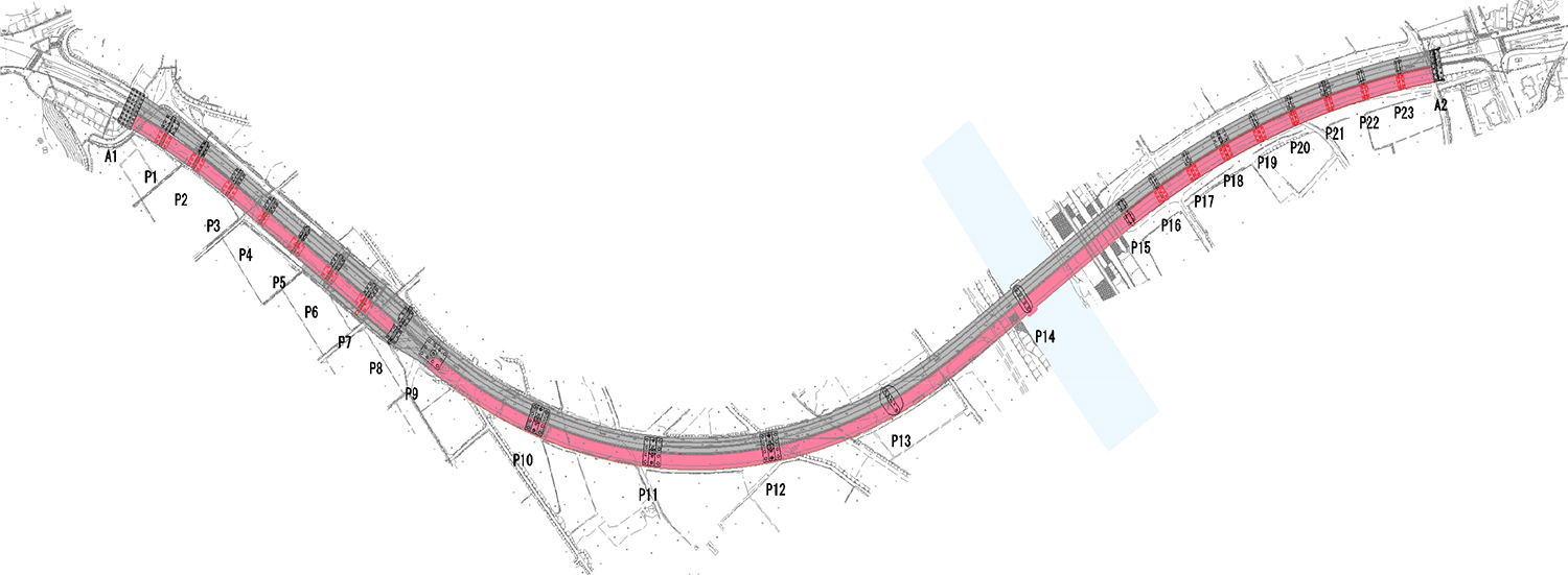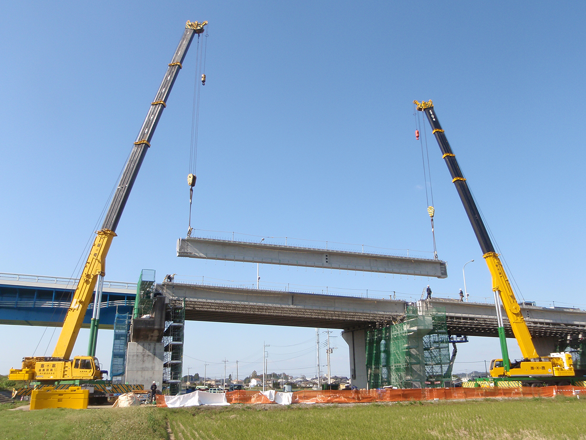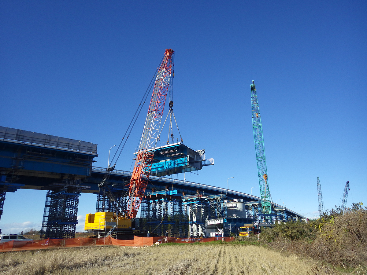 施工にあたっては早期復興を図るため、河川管理者との協議を入念に行い、下部工事、上部工事をすべて平成27年度内に発注して、橋梁本体工事を3カ年度(2回の非出水期)という短工期で完成させました。また、すでに旧基準で整備されていた4車線一体型の橋脚については、平成24年の道路橋示方書の基準に対応した耐震補強(橋脚コンクリート巻立て工)を実施するとともに、上部工も既設橋(4車線化後の下り線)と比べて連続桁の多径間化を図るなど、耐震性の向上に配慮しています。