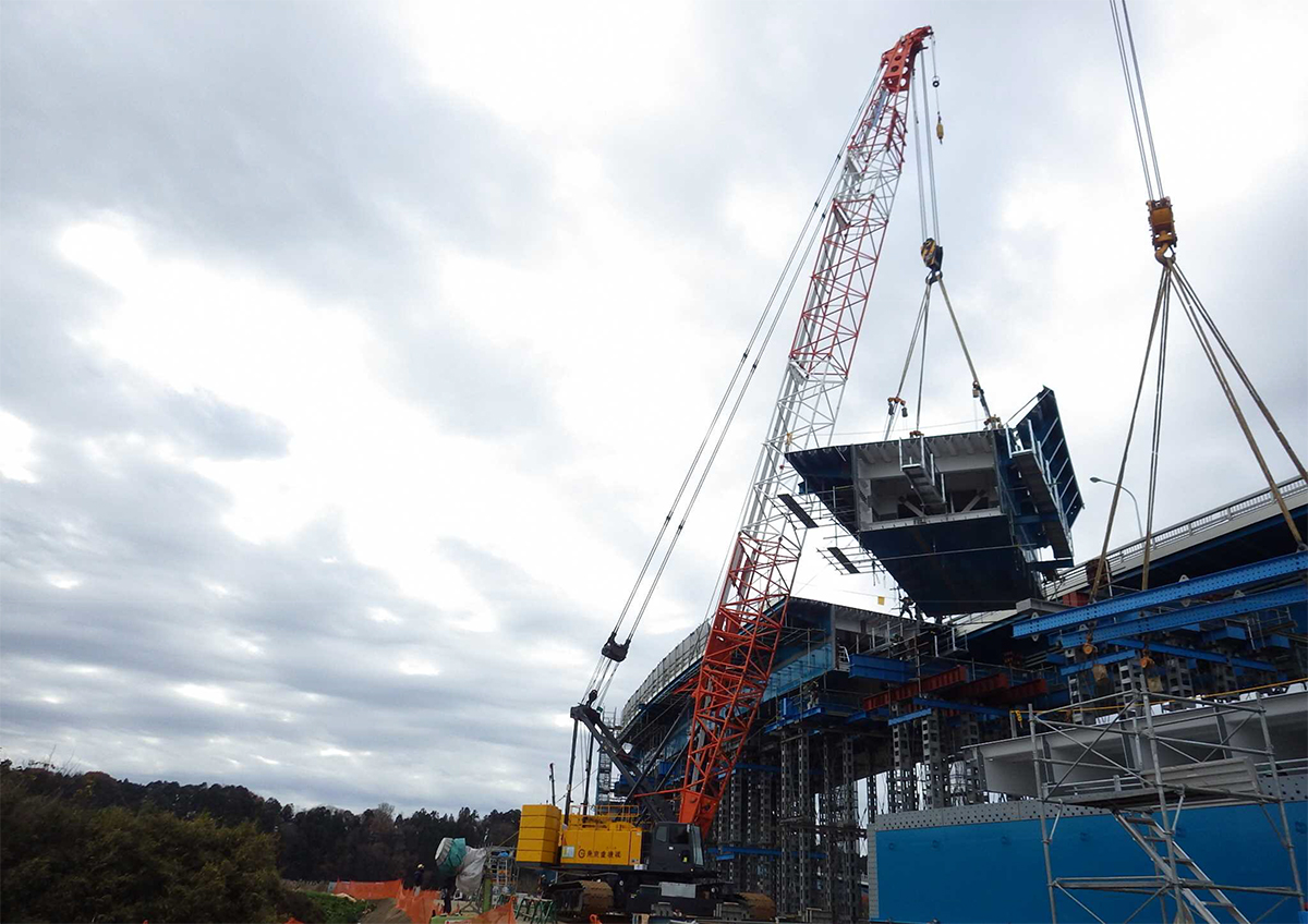 鋼橋区間の架設では既設橋との離隔が0.1mと近接施工であったことから、接触防止対策が必要になりました。具体的には、桁を既設橋から離隔1.1mの位置に一旦設置した後、1.0mの横取り架設を実施したことと、側床版と主桁の連結部に回転用治具を設置し、架設前に主桁の中心側に側床版を折りたたんだ状態で架設することで、既設橋との離隔距離を1m以上確保して接触を防止しました。