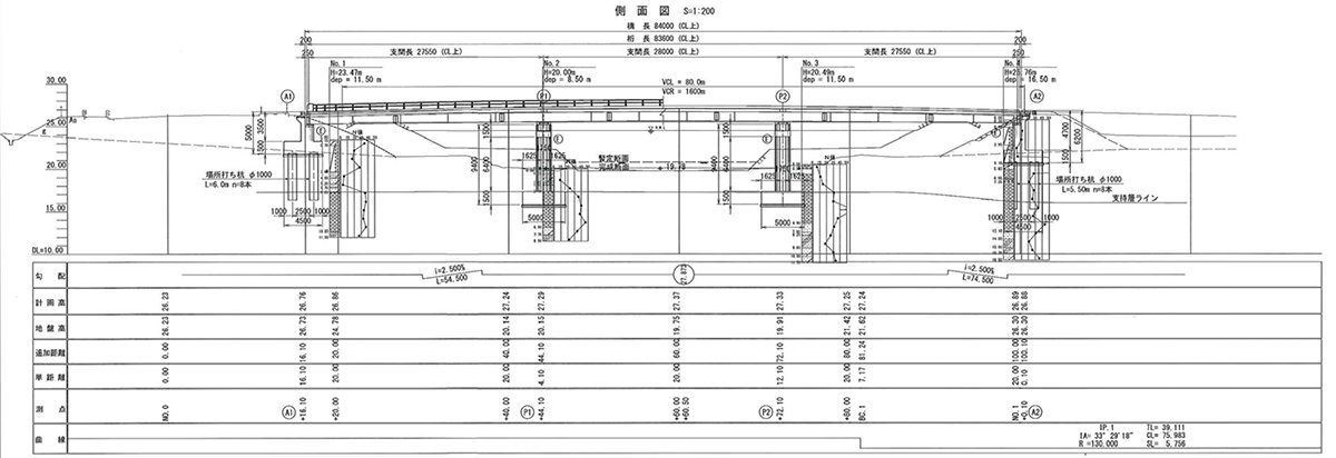 架替え橋は橋長84m、全幅員10.5mの鋼3径間連続合成鈑桁橋で耐候性鋼材(裸仕様)を採用しています。旧橋は歩道もなく幅員も狭小でしたが、それを改善し、歩道も設置しています。