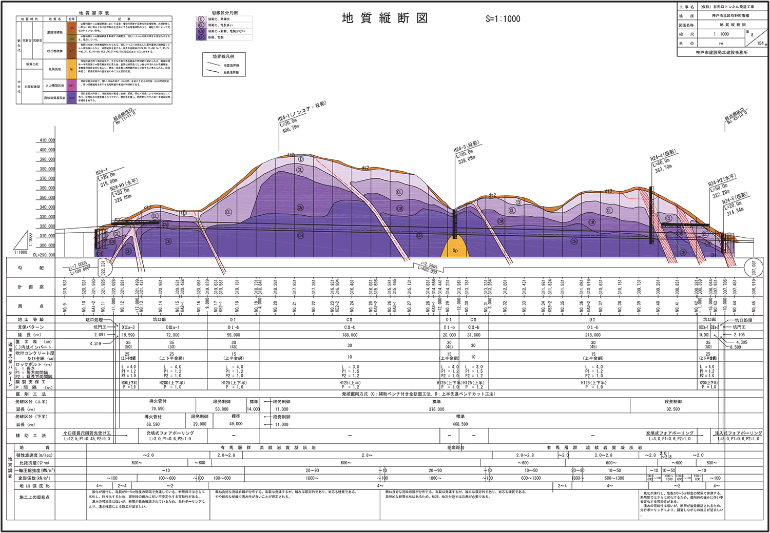 (仮称)有馬口トンネル地質縦断図および標準断面図