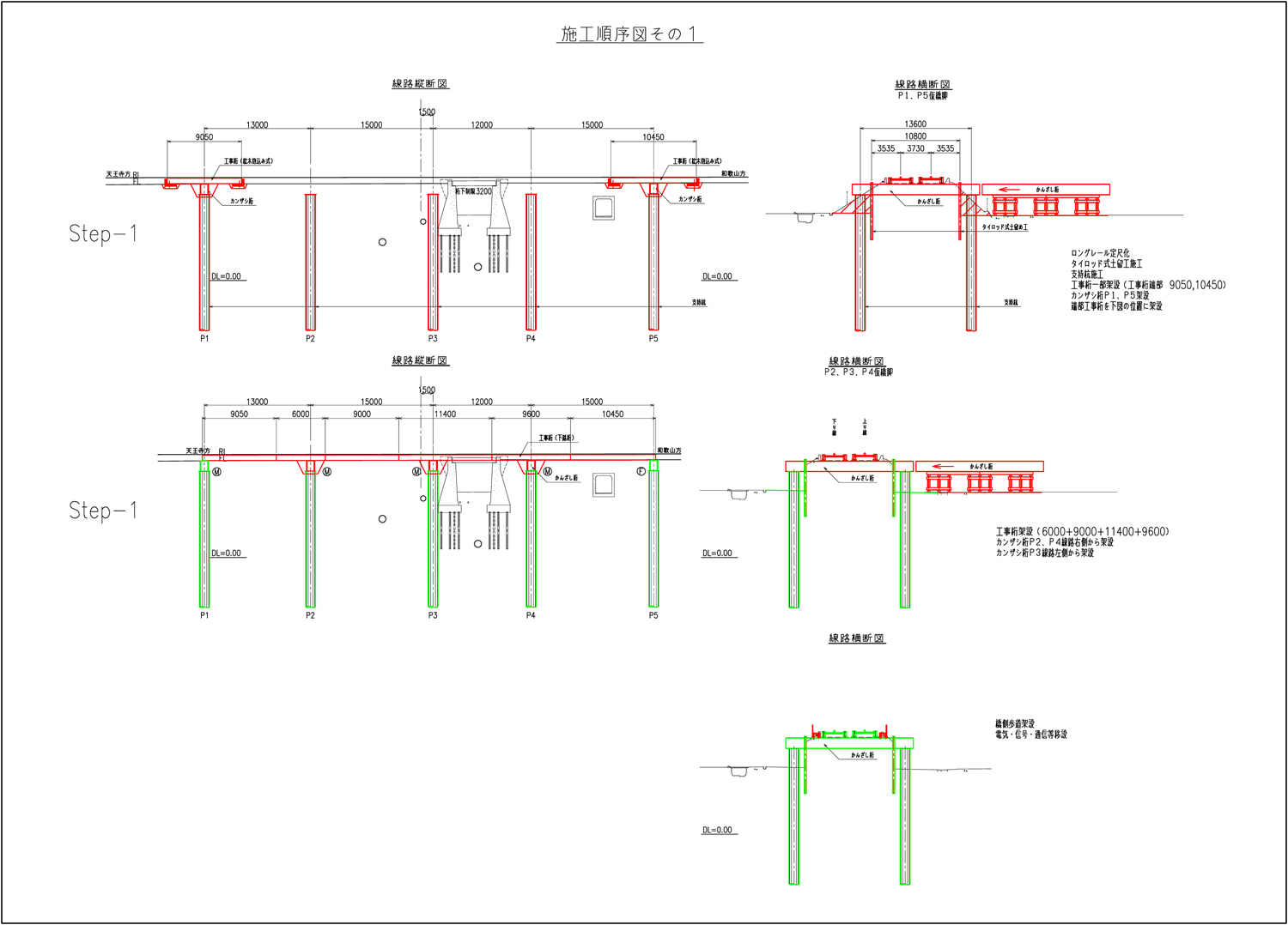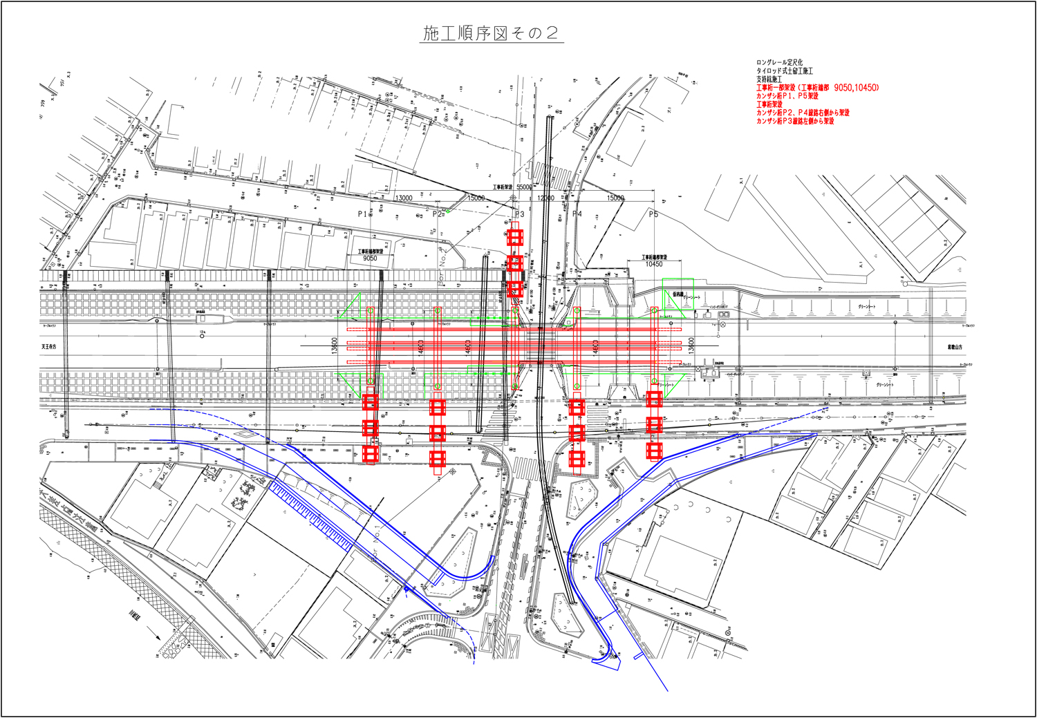 具体的な施工方法としては、線路軸方向に56.5mの工事桁を順次架設、さらに線路軸直角方向に5本のかんざし桁(13.6~14.6m)を順次配置し、線路の変状を起きなくした上で、掘り下げを順次行い、基礎杭(5か所)を施工した上で、カルバートボックスを構築していくものです。現在は掘り下げが進んでいる状態です。