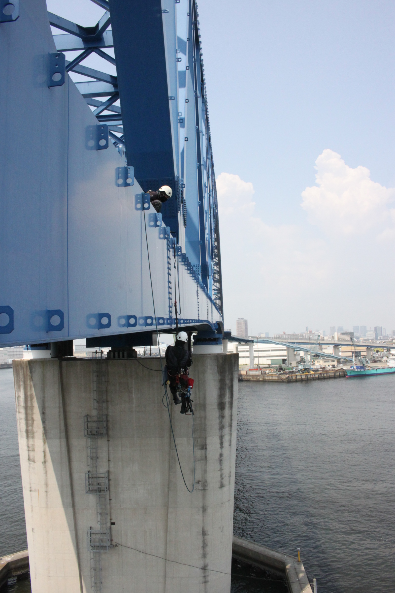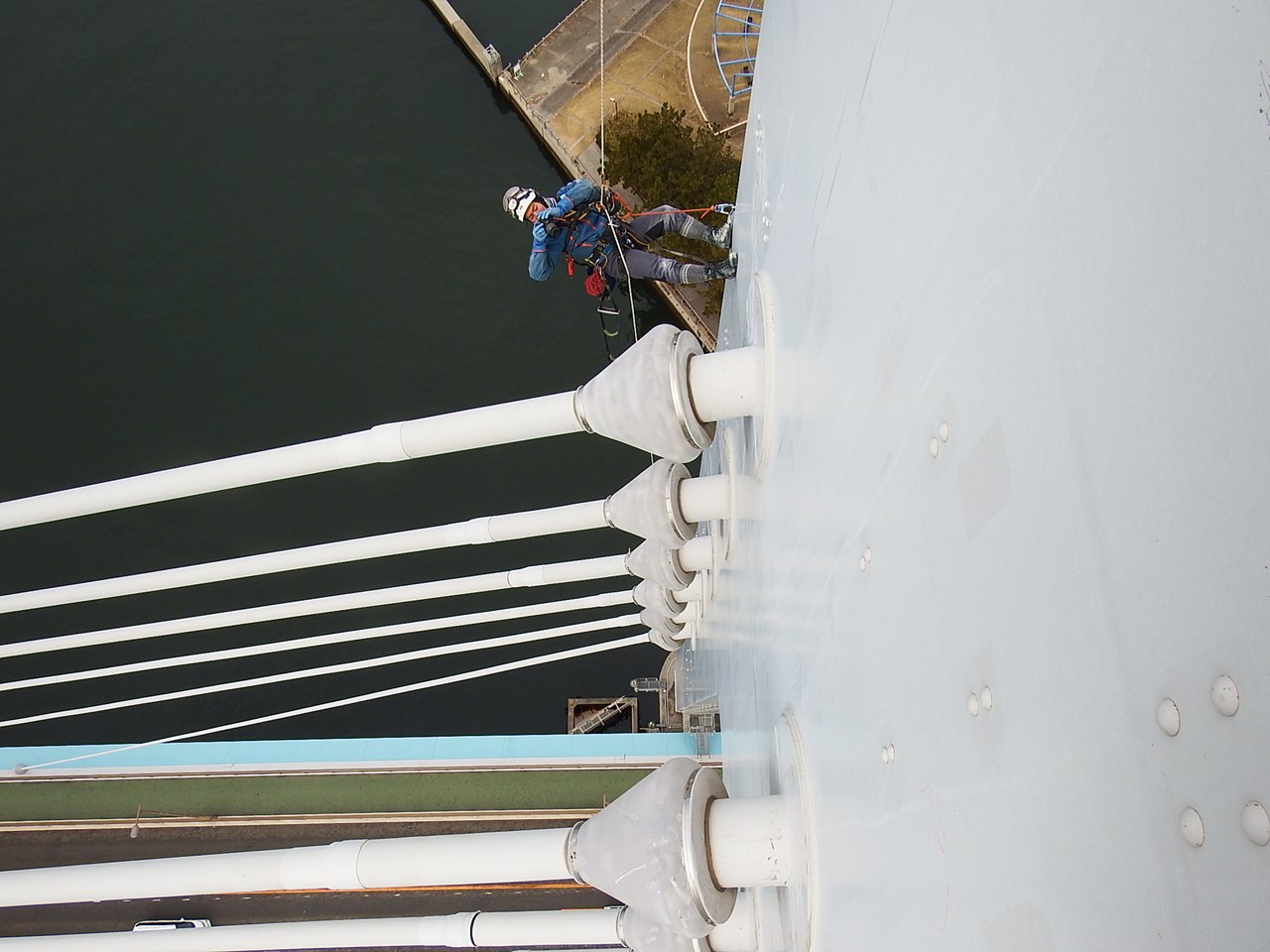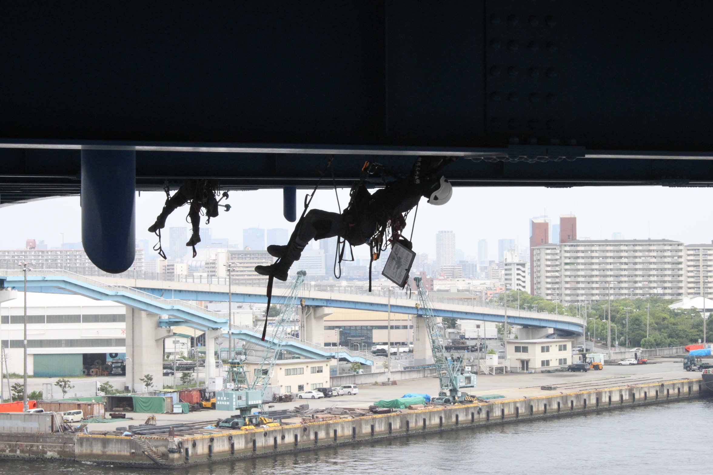 尾崎 点検に際して足場コストの低減のためロープ高所作業を昨年度から本格的に導入しています。また平成29年度には、当市と大阪商工会議所が締結した「実証事業都市・大阪実現に向けた包括提携協定」、の枠組みの中で、常吉大橋(大阪北港マリーナと北港緑地を結ぶ鋼斜張橋)をフィールドとして、ドローンによる点検の実証実験が行われました。結果としては、いまだ改善の余地がありそうです。