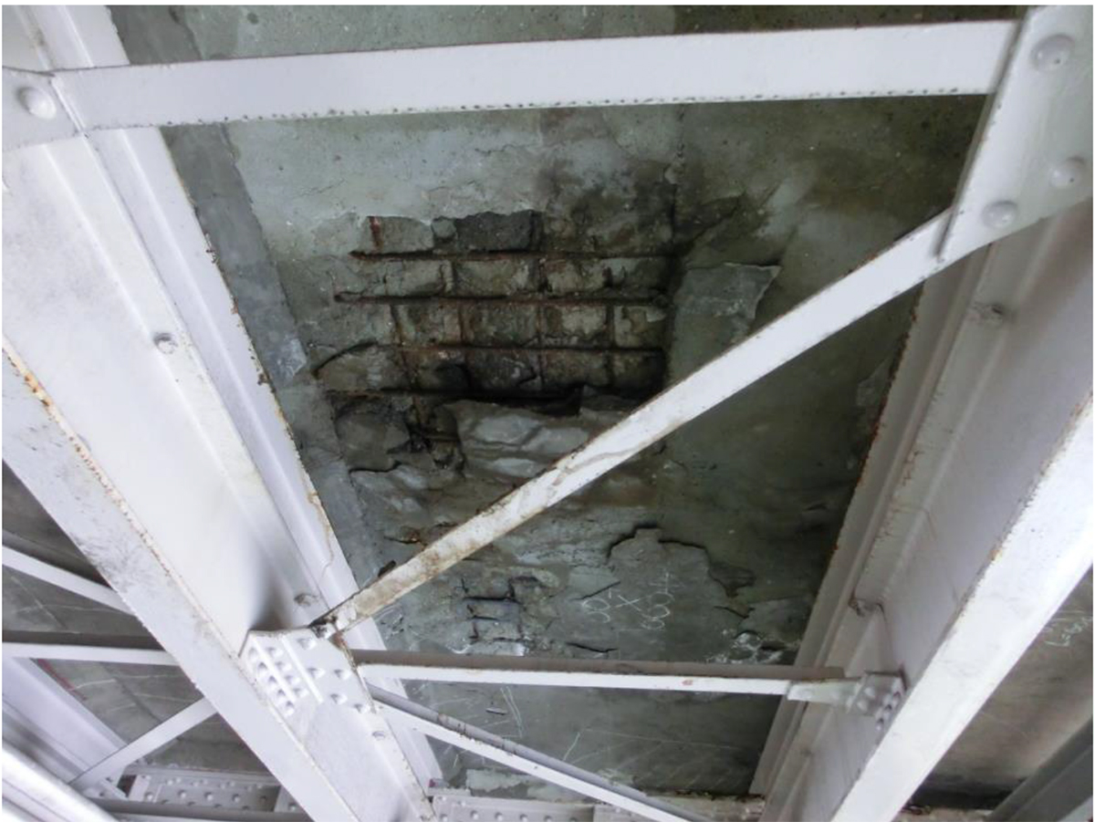 橋面舗装の亀甲状のひび割れ/RC床版下面の被りコンクリート剥落・鉄筋露出