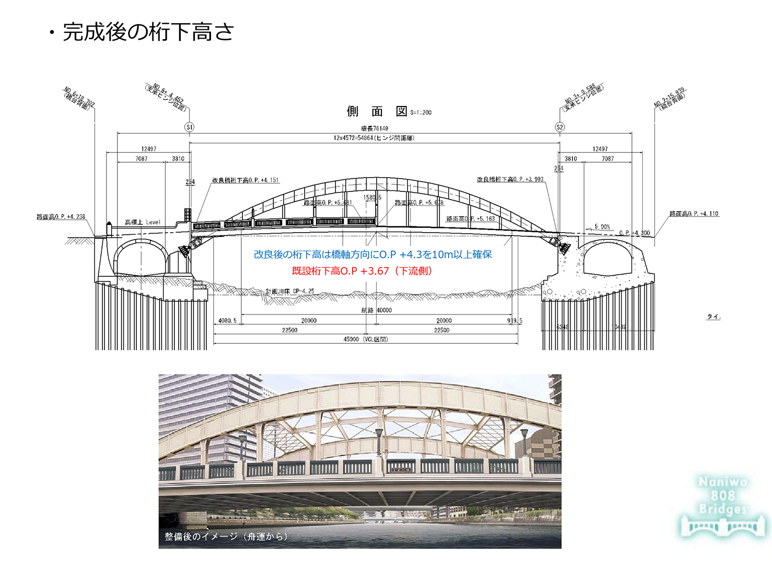 尾崎 同橋は昭和2年に供用した橋長76.14mの下路式2ヒンジソリッドリブ鋼アーチ橋です。床組部材や床版の経年劣化が進行しており、対策の必要があります。もう一つは大阪ならではの要因ですが、観光船が非常に増えている状況下で、周遊観光の活性化という観点からも床組を取り換えて、鋼床版化することにより桁高を約60㎝低くして、船が衝突しないような桁下クリアランスを確保しようという二つの要因から工事を進めています。