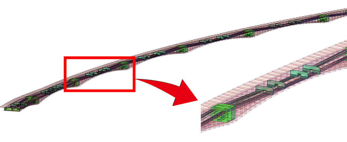 2次元の図面では外ケーブルの干渉がわかりませんが、それが一発で分かるようになっています。また、現地の測量にあわせて設計を調整して、現地に合わせることができるという利点もあります。岩手県久慈市の国道45号夏井高架橋工事で初適用しました。また、同工事では、SMC-modelerを含めた各種ICTシステムをプラットフォーム上で連携させ、一元的な管理・運用を可能にするトータルシステム「SMC-Bridge」も初適用しています。国道45号有家川橋工事でも適用する予定です。
