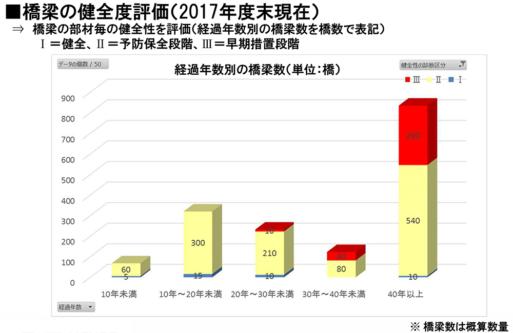 池田 経過年数が古い橋梁にⅢとⅡが集中的に多くなっています。年代別でみると、Ⅲは30年以上に集中していて、新しい橋梁にはありません。古いところをしっかりと補修していく必要あります。