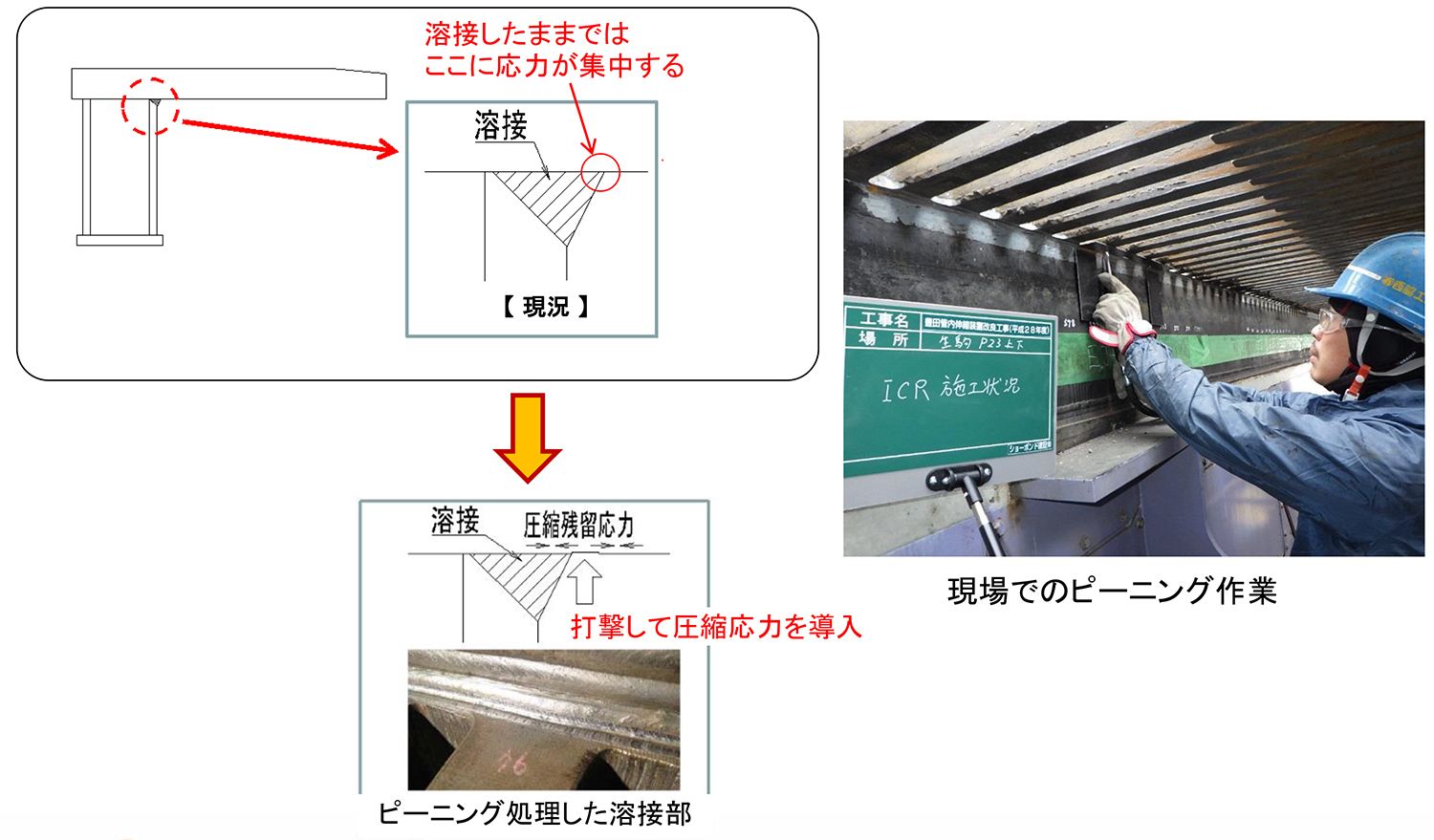 池田 ビーム型は取替えても必ず溶接部分が必要であり、そこが割れてしまいます。このため、ビーム型はすべてやめて、鋼製フィンガーに取替える工事を行っています。鋼製フィンガーで損傷のないものは、溶接部をピーニング処理により疲労強度を高める長寿命化策をとってきます。鋼製フィンガーと下の箱断面の受け部材との溶接にクラックが入るので、その負荷を減らすために溶接部をピーニング処理することによって、疲労耐久性を上げるものです。壊れる前に対策すれば寿命が伸びます。クラックが入ったものは取替えるしかありません。