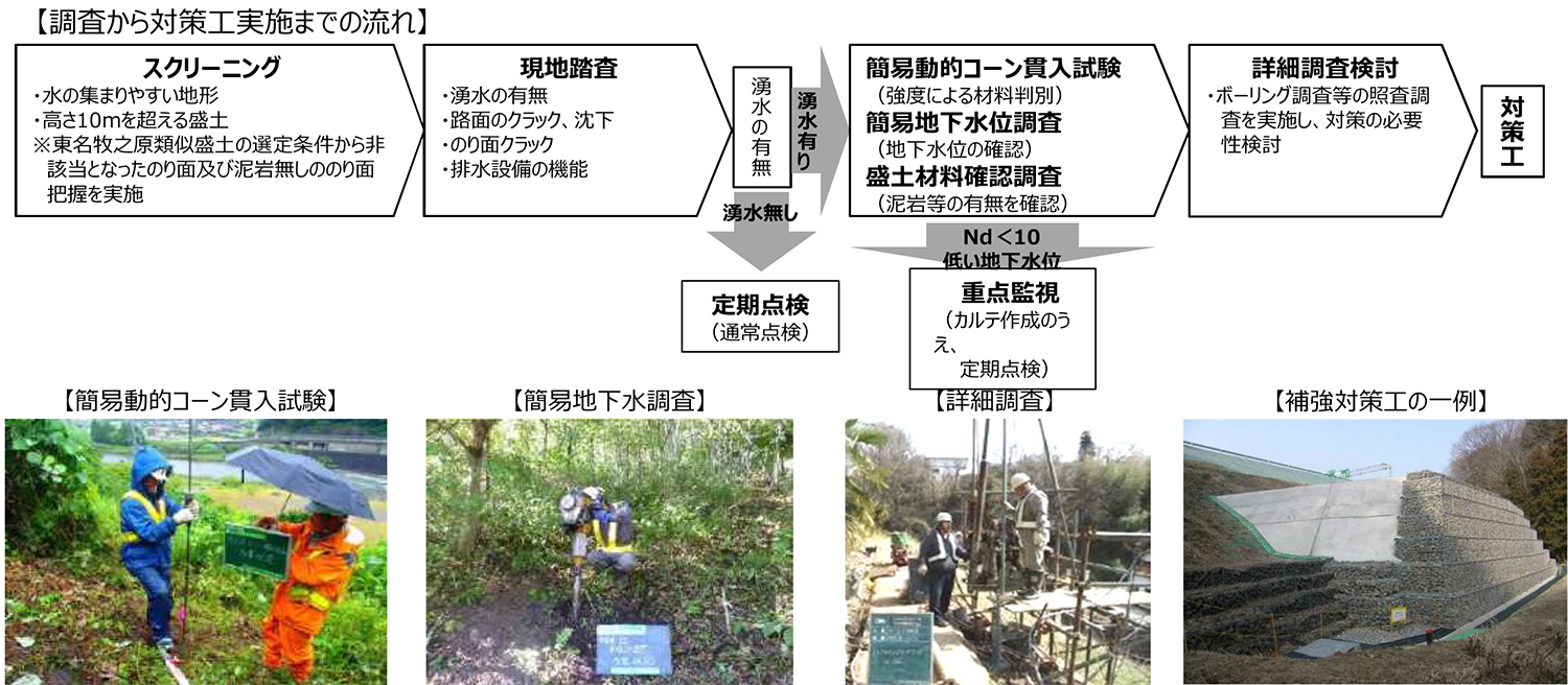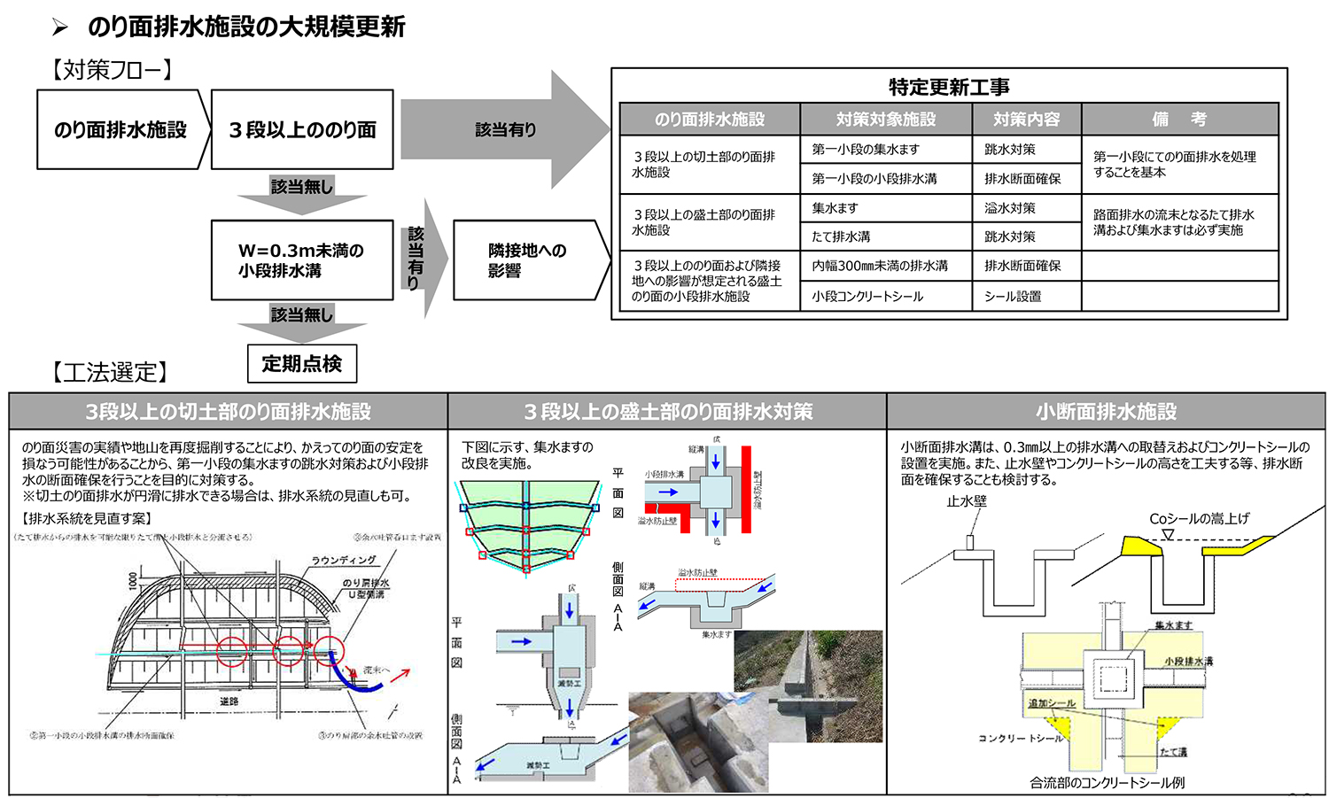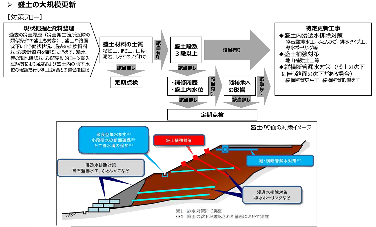 具体的には盛土内の浸透水排除対策、盛土補強対策、縦横断管漏水対策などです。
