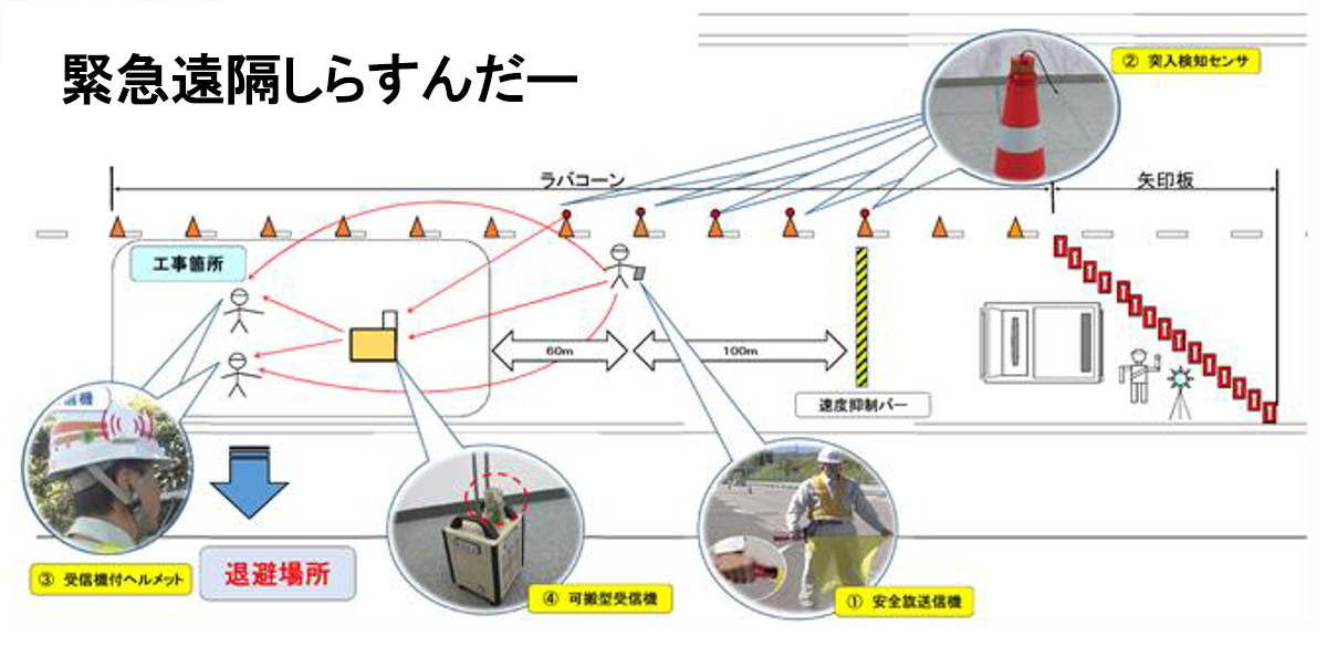 池田 緊急避難信号送信システム「しらすんだー」と遠隔通報システムを合体させた安全対策を活用しています。安全旗に内蔵されているボタンを押すと警告音が鳴るシステムがしらすんだーですが、車両突入時に人の操作に頼るだけではダメで、それとは別に、ラバコーンにセンサーを取り付けるタイプと周波数を統合して、どちらでも現場に知らせられるようにしたシステムです。また規制先端にある矢印板にも同様のセンサーをつけることで、車がどこから突入しても作業員に知らせることができるようになります。昨年、多治見で作業員が規制内でひかれる事故があり、対応をさらに強化しました。