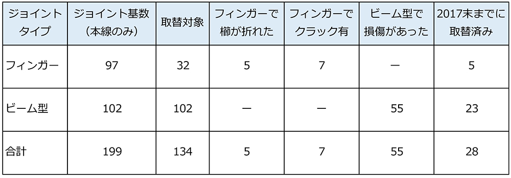 池田 ビーム型の損傷個所は55、フィンガーでくし部分が折れた箇所が5、フィンガーでクラック有7箇所です。67箇所のうち、28しかできていません。ただ、この中には何度も割れているものがある。応急措置をしても1回割れたものはすぐに再発します。