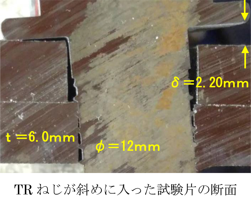 引張接合継手の場合については、昨年実験をしてある成果を得ています。TRねじを故意に斜めに入れた試験片と真直ぐに入っている試験片の強度がどの程度違うかということを調べました。そうすると、ねじのフランジの一部が上板についた状態で、ねじのフランジと上板の隙間の最大値が2mm位までだったら、その継手の強度はねじが真直ぐに入った5体の試験片の強度のバラツキの範囲内に収まっていることが分かりました。しかし、この隙間が2.5mm以上あると、TRねじが真直ぐ入った5体の試験片の強度のバラツキの最小値よりも下がることが分かりました。数少ない試験片の結果ですが。