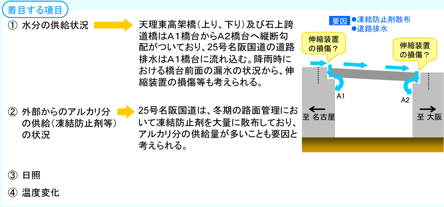 原 塩害は針ICの管理道路橋で生じています。また、ASRは過去に天理東跨道橋(上下線)、石上跨道橋で生じており、補修を施しています(平成26年度)。