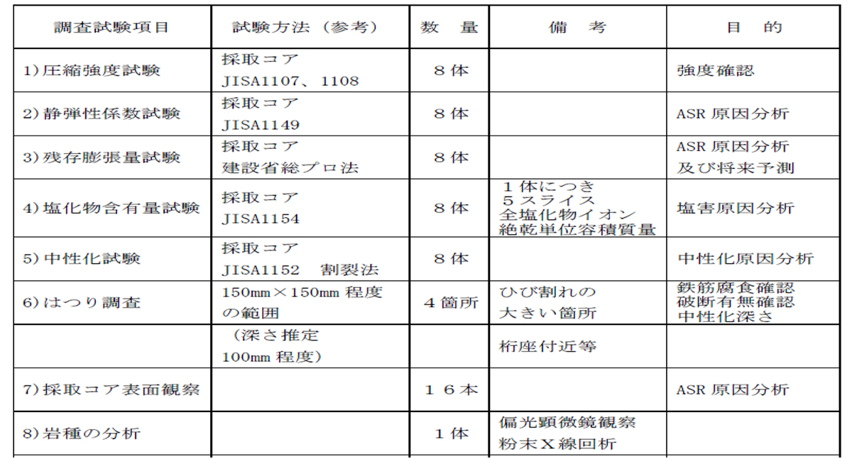 ASRは両橋とも橋台部で損傷が生じていました。A1橋台からA2橋台に向けて下り勾配が付いており、名阪国道の道路排水は主にA1橋台に流れ込む状況です。降雨時においては、橋台前面に漏水が生じており、伸縮装置の損傷も考えられました。さらに冬季には路面に大量の凍結防止剤を散布しており、これがASRを助長する要因と考えられました。そのためコアをA1橋台から16本採取し、①圧縮強度試験、静弾性係数試験、②残存膨張量試験、塩化物含有試験、④中性化試験、⑤斫り調査を行いました。段階としては膨張しきって終局状態にあると判断しました。