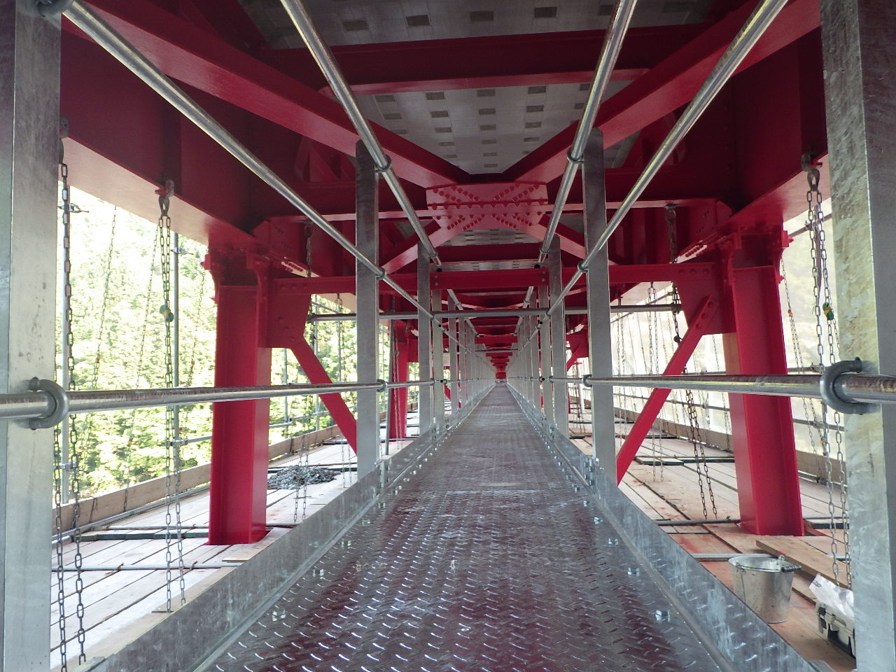 原 鋼材に亀裂が生じている箇所(垂直材の上端部および横桁取り付け部)では削り込み除去し、疲労に対して脆弱な構造である垂直材上端部はボルト接合による当て板補修を施しています。また、鋼桁全面に塗り替えを行い、RC床版下面に発生しているひび割れについては低圧で樹脂を注入して補修しています。また伸縮装置の真下にはフェールセーフとして受樋を設置し、漏水が橋台や鉛直材、アーチ桁端部に降り注がない構造に改良しました。合わせて、今後の点検を容易にするため床版下面や端部の垂直材、アーチリブの下端部に橋梁検査路を設置しました。