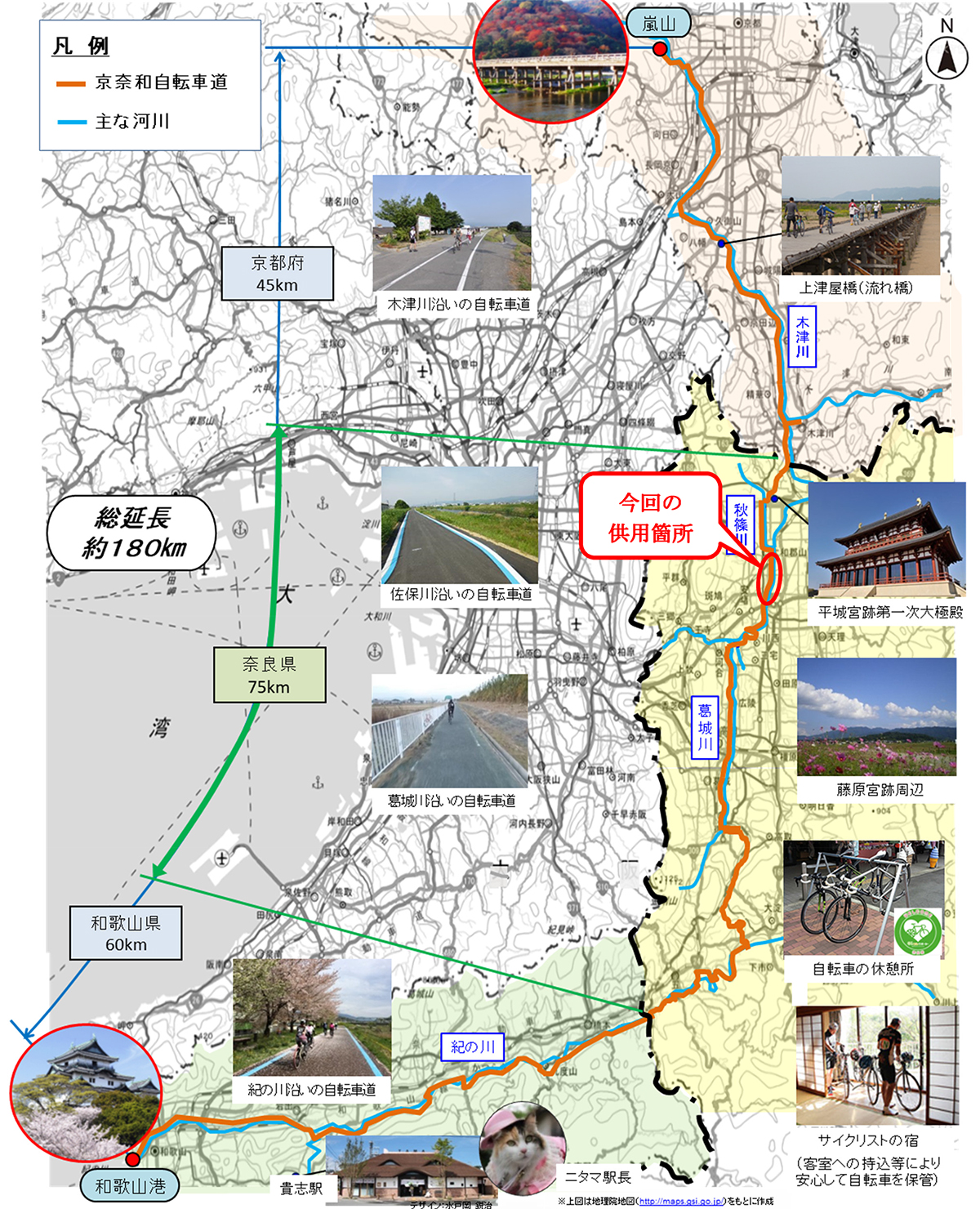 ――観光振興という点でもう少し詳しく  山田 奈良市内については、奈良公園周辺の渋滞がひどく、定時性が確保されず、渋滞が観光振興上のネックになっています。たとえば、平城宮跡から奈良公園を経て春日大社等の重要観光拠点をつなぐ直通バスはわずかな便数しか走っておらず、平城宮跡から他の社寺を巡るバスについても定時性が確保できないため、路線バスは運行されていない状態です。  定時性を確保するためには、国土交通省が所管している名阪国道や奈良県が所管している大宮通り、その周辺道路について交差点改良事業を進めていくべきだと思っています。また、パークアンドライドも活用すべきで、2011年から毎年期間限定で実施しています。今年のゴールデンウイークには車に乗っている方々が500円で1日間市内観光できる周遊バスに乗り放題となる木簡型一日乗車券という試みを行い、好評でした。奈良公園周辺の渋滞は、観光目的の車両に起因するため繁閑期の差が大きいのも事実です。 ?まずは年間を通じ約9割の需要には(交差点改良などで)対応しつつ、ピーク時にはパークアンドライドなども組み合わせて全体の円滑化を図っていくのが合理的だと思います。特に幹線道路が全通し、交通の流れが劇的に緩和されるまでは、このように工夫しながらマネジメントすることが、当面の速攻対策として必要だと思っています。  ――交差点改良は効果的だと思いますが、一方で奈良県は用地買収が非常に難しいと聞きます  山田 おっしゃる通りです。本来は、交差点改良する部分と歩道を広げるための用地買収を同時に進めることが望ましいと思います。ただ、用地買収が難しく簡単にはいきませんがその中で奈良市内の世界遺産を周るルートとして、いわゆる地域内の幹線部分は少し幅広く計画を立てて景観にも配慮できればと考えています。  ――京都や神戸、大阪では自転道の整備なども積極的に進めていますが、奈良県は  山田 京奈和自転車道の整備を目指しています。同自転車道は京都市の嵐山から奈良県内を抜けて和歌山港に至る総延長約180kmの事業になります。奈良県内では奈良市から五條市までの延長約75kmを所管(右図、奈良県発表資料より抜粋、下写真も同)しており、2017年11月には大和郡山市内の4.4kmを初供用しました。東京五輪が開催される2020年の概成に向けて取り組んでいきます。  また、この路線だけでなく、沿線の観光拠点とのリンクや、既存の自転車道である「ならクル」(奈良まほろばサイク∞リング)と連携することにより、観光周遊の有力な手段としての活用を考えています。