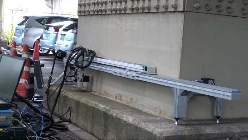 鋼製橋脚の地際部(全長が数メートル)にも適用できるように、ガイドレールを介して自動探査するシステムを構築しています(写真7、左)。地際コンクリートからの検査深さは20~30mm程度で、検査範囲は約4mです。都市内高架橋の鋼製橋脚で推定精度を検証した結果、±1mm程度の高精度で腐食深さが推定できることが分かりました。