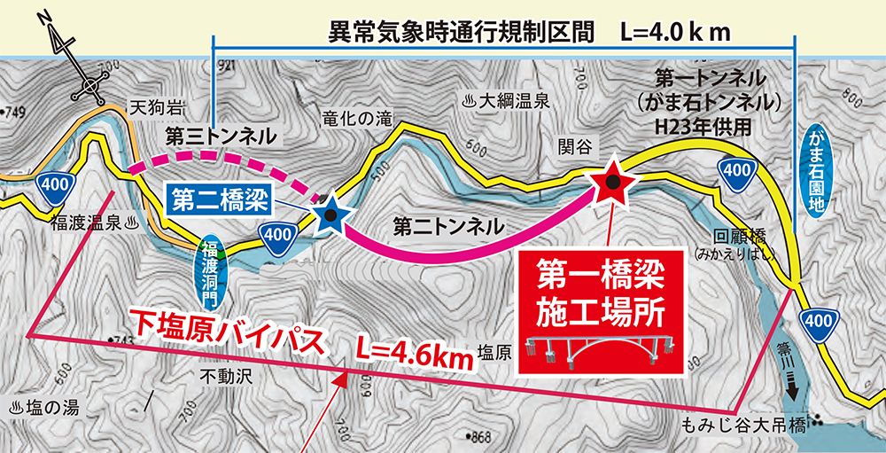 江連 那須塩原市関谷~同市塩原までの延長4.6kmのバイパス整備事業で、構造物はトンネル3本と橋梁2橋で構造物比率は88.2%です。3工区に分割して工事を進めていて、起点(関谷)側のⅠ期工区は、がま石トンネル(延長1,464m)の完成により平成23年に供用しました。