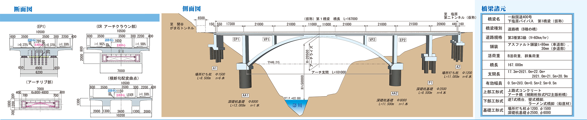 下塩原第一橋梁(仮称)が施工中となっています。橋長167m、有効幅員9.5mの上路式コンクリートアーチ橋(補剛桁PC2主鈑桁橋)で、アーチ支間長は101mです。