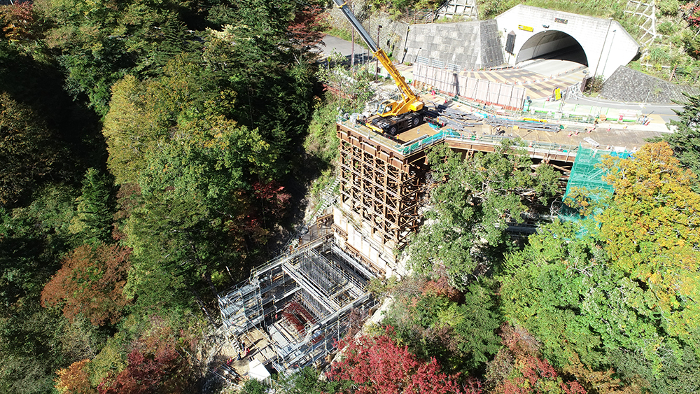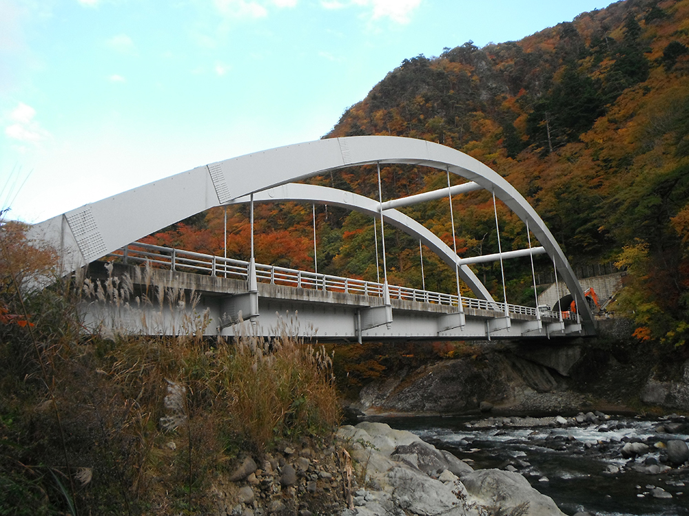 現在、Ⅱ期工区の工事を進めていて、構造物としては下塩原第二トンネル(仮称)(延長1,458m)と下塩原第一橋梁(仮称)、下塩原第二橋梁(仮称)があります。トンネル掘削にあたってはバイパス沿いに流れる一級河川箒川を渡河する必要がありましたので、下塩原第二橋梁(仮称)を最初に建設して工事用道路として使用しました。下塩原第二橋梁(仮称)は橋長86mの下路式鋼ローゼ橋で、平成23年に完成しました。下塩原第二トンネル(仮称)はNATMで掘削し平成27年に本体工が完成して、これから舗装と設備工事の発注を行います。