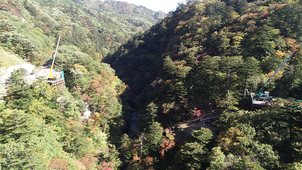 江連 架設位置が国立公園特別地域であるため、架設による周辺の形質変更が少なくてすむ斜吊りによるメラン架設工法を栃木県内では初めて採用します。施工は川田建設・西松建設・桜岡建設JVです。