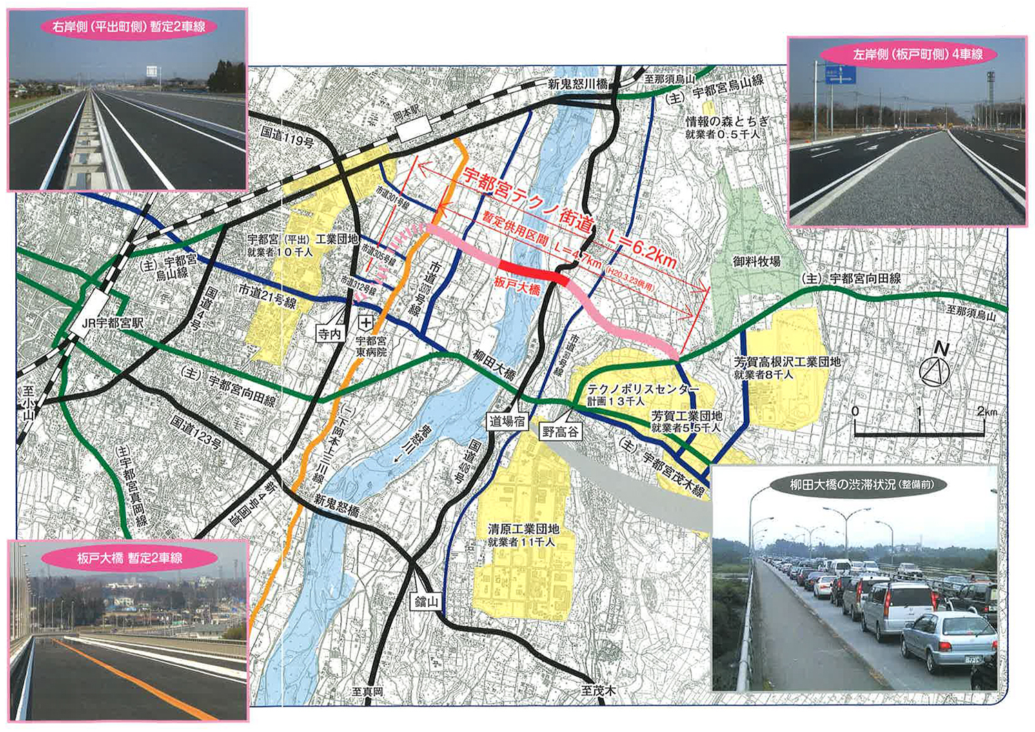 江連 LRTが完成すれば当該区間の渋滞緩和や移動の円滑化が図れ、公共交通網の軸となると思いますが、工事中の渋滞を懸念する声が高くなっています。従来から渋滞が激しい区間でしたので道路整備の一環として宇都宮テクノ街道(県道宇都宮向田線)の事業を進めてきましたが、その一部区間を前倒しで平成31年春に供用して、LRTの工事期間中の渋滞緩和を図っていきます。具体的には、新4号国道との交差部0.6km(暫定2車線)と、芳賀台北交差点から高根沢町台ノ原地内の交差点までの1.58km(4車線)となります。