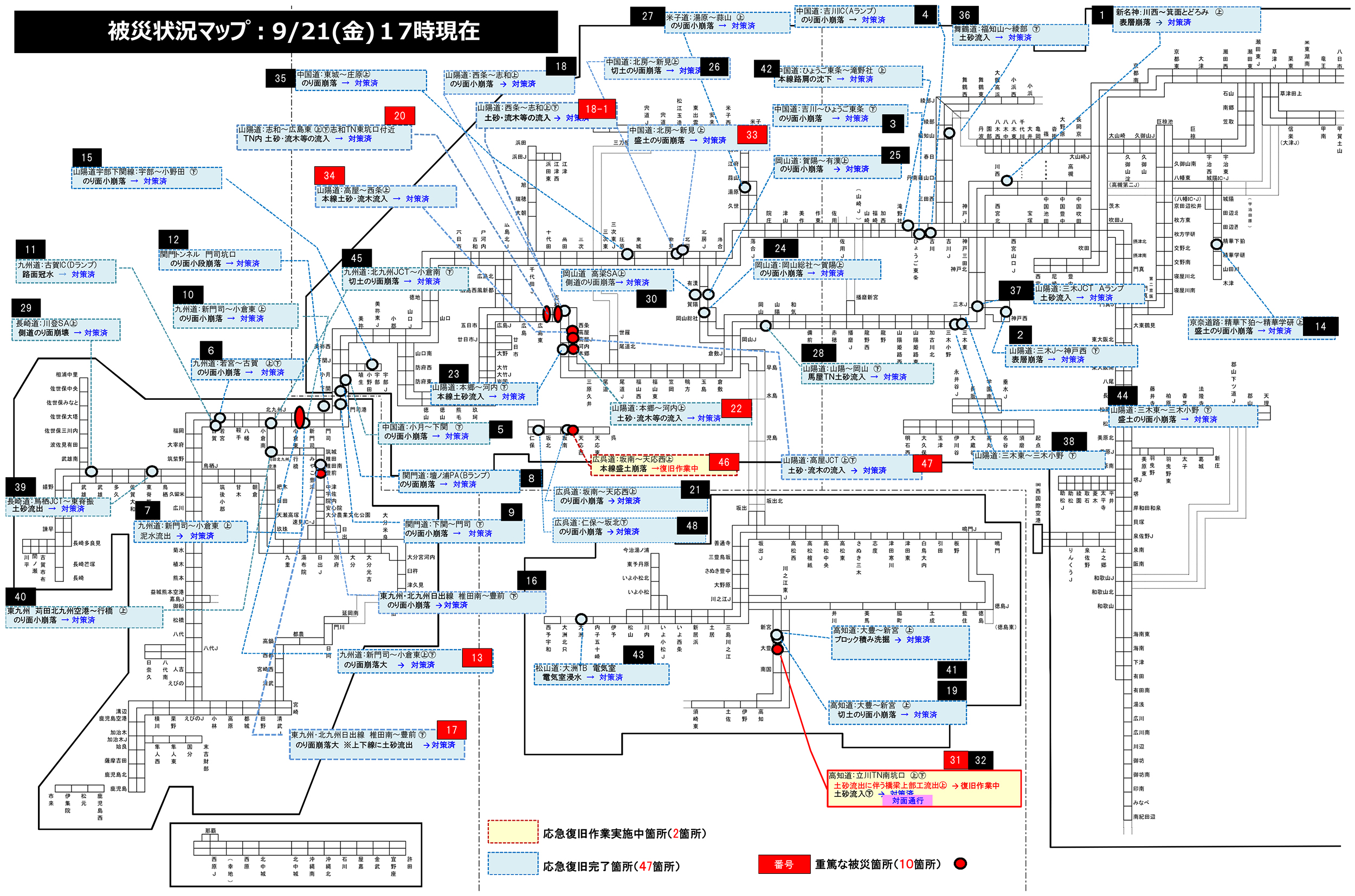 NEXCO西日本管内の高速道路の被災状況(9月21日17時時点)